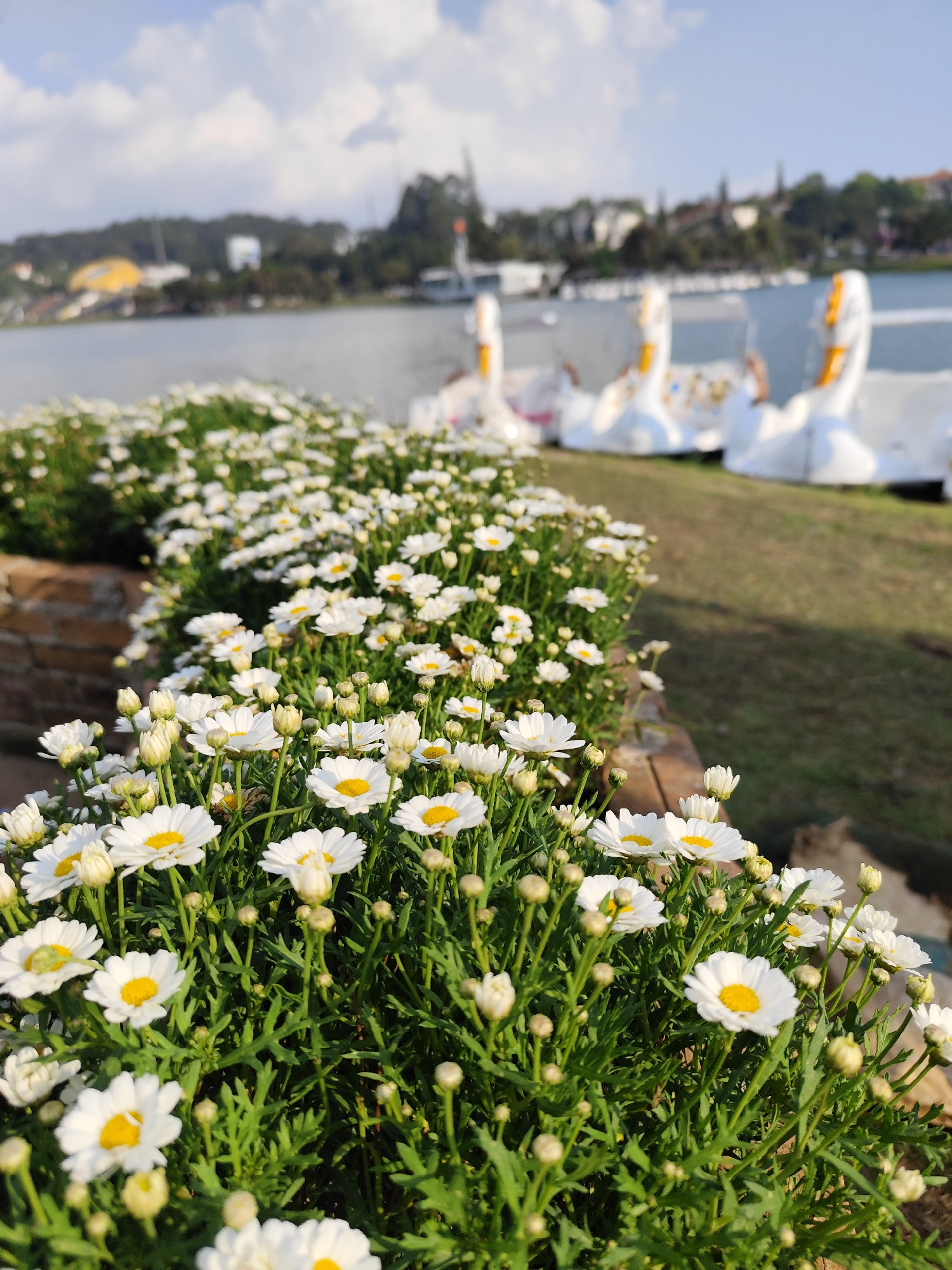 A daytime, eye-level shot captures a landscape in Da Lat, Vietnam. The foreground features a dense row of white daisies with yellow centers, growing from a raised brick planter. Behind the flowers, a…read more