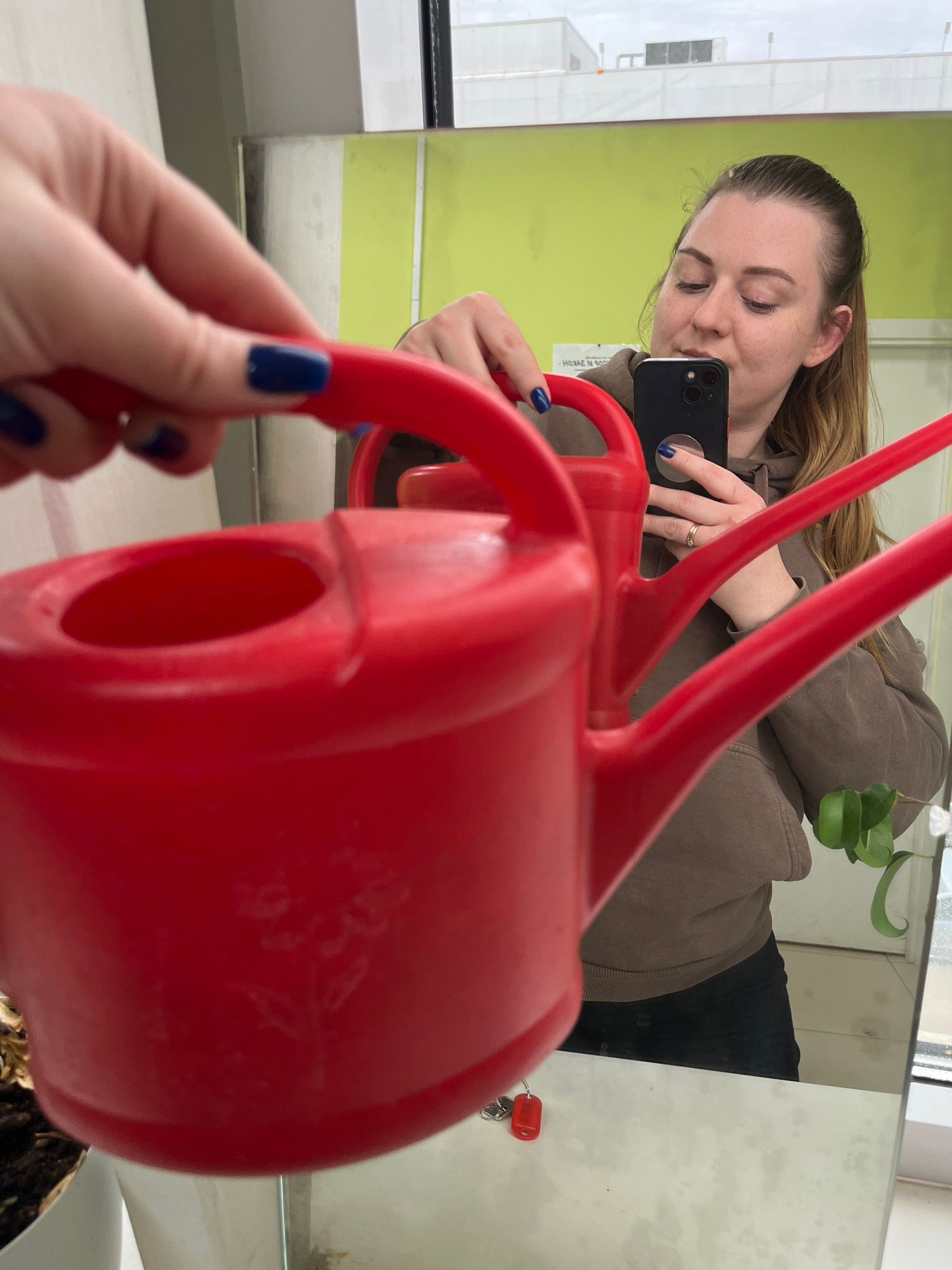 A woman is taking a selfie in a mirror while holding a red watering can. The woman is wearing a brown sweatshirt and has dark hair pulled back. She is holding a black smartphone. The mirror reflects t…read more