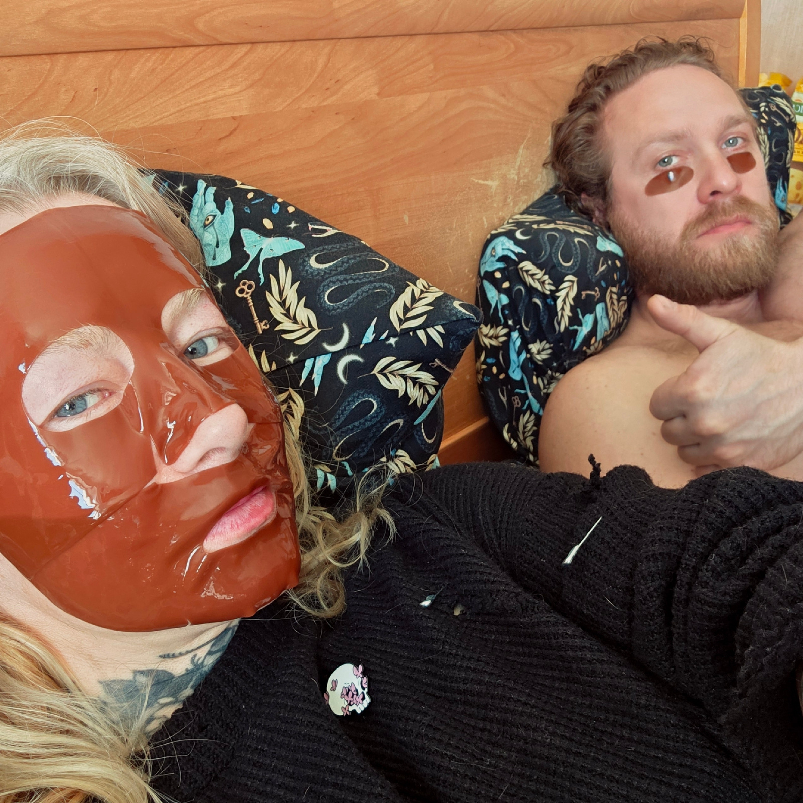Two individuals are lying on a wooden surface, possibly a floor. One person has a beard and is wearing under-eye patches and patterned clothing with images of keys, creatures, and moons. The second pe…read more