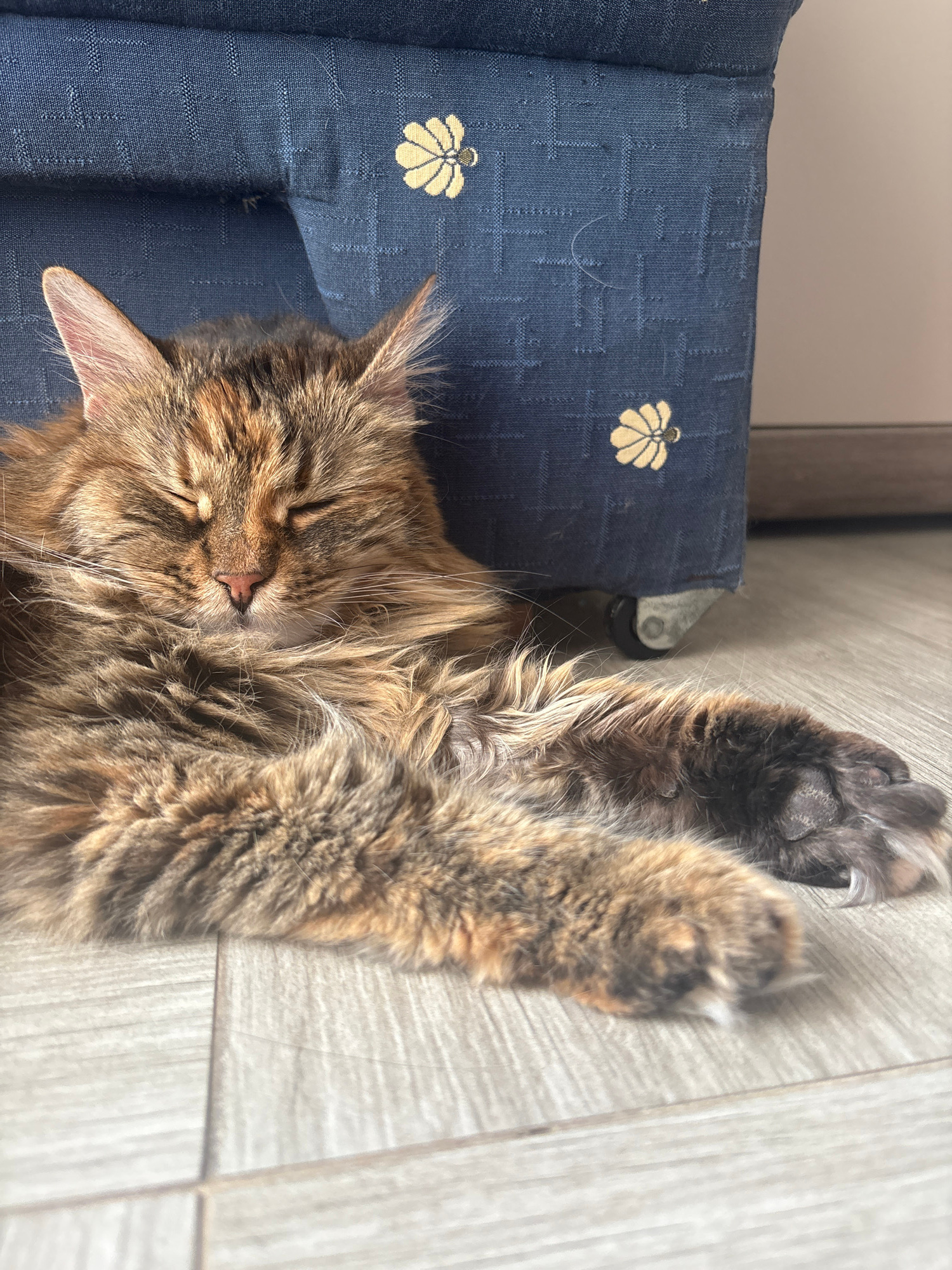 A brown and tan long-haired cat is asleep on a blue cushioned chair next to a light wood-grain floor. The cat is positioned on its side with its head resting on the chair. One paw is raised in the air…read more