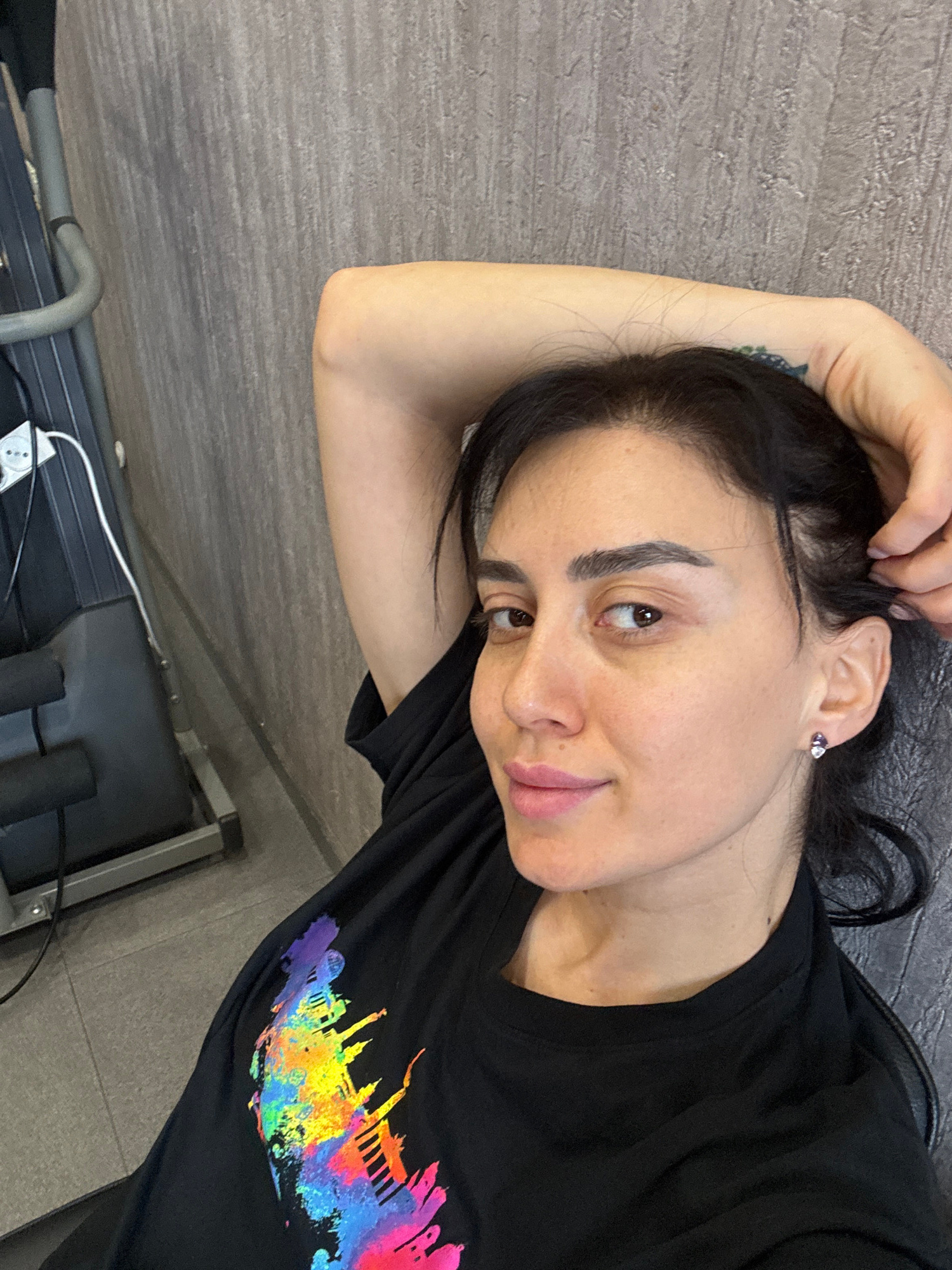 A woman lies on a tiled floor next to a gray exercise machine with a white power cord. She rests her head on her left hand, fingers touching her hair. A small tattoo is visible on her left wrist. She…read more