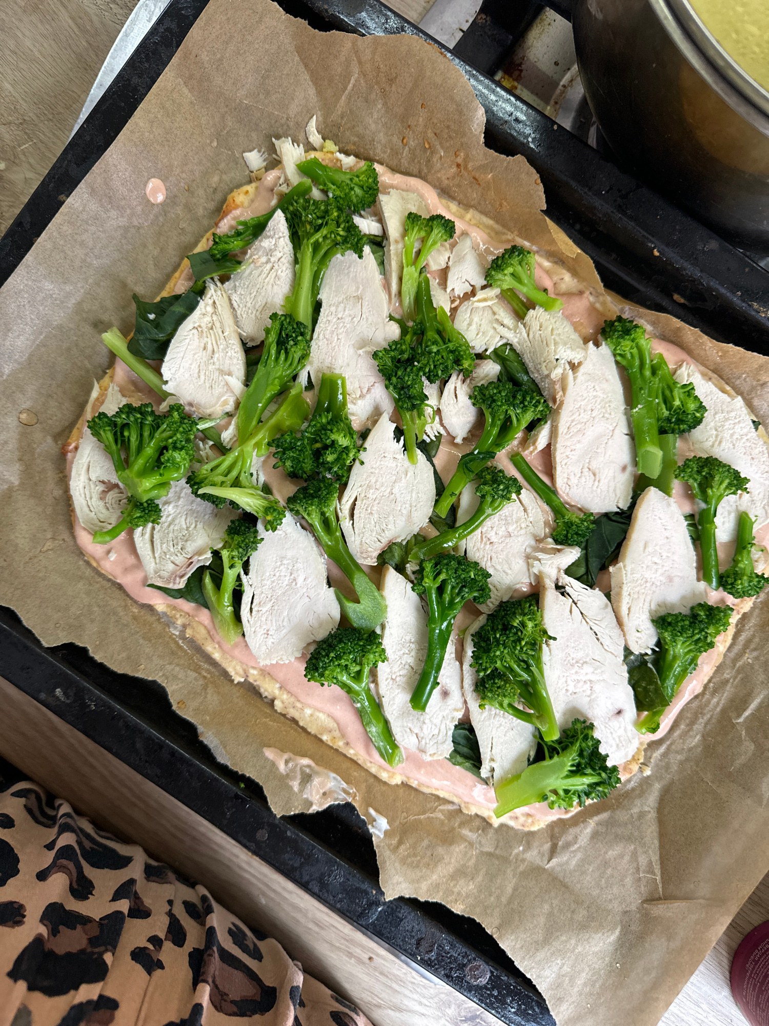 The image shows an uncooked rectangular pizza on parchment paper, placed on a black baking sheet. The pizza is topped with a pink sauce, spinach leaves, sliced chicken, and broccoli florets. A stainle…read more