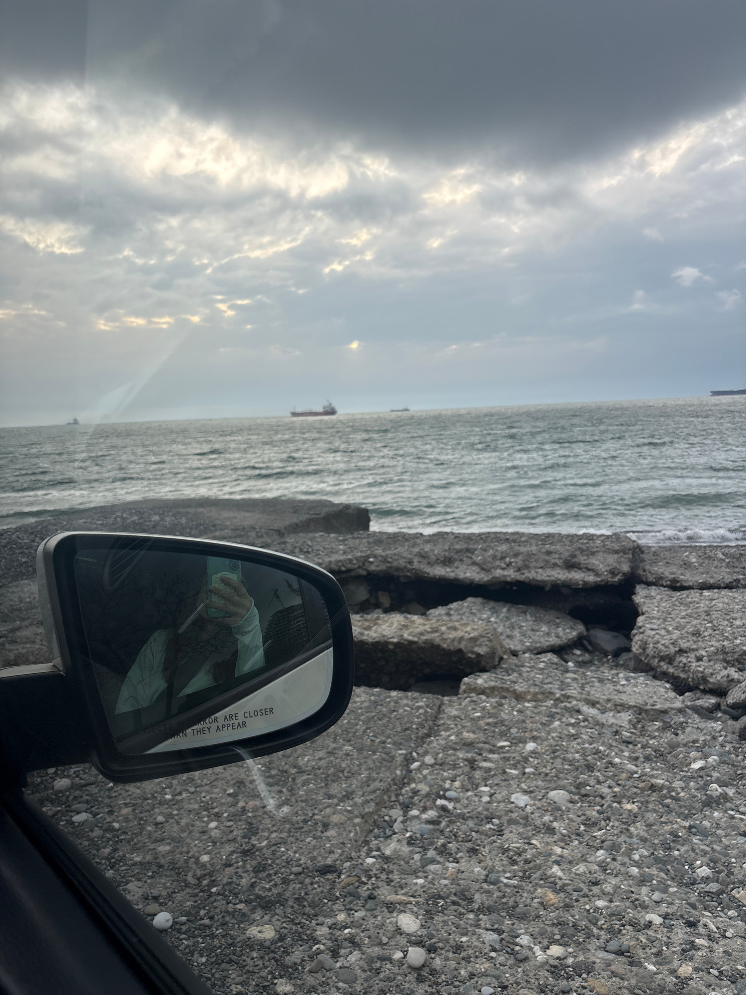 The photograph, taken from inside a car, looks out towards the sea. A car's side mirror is visible, reflecting the person holding a cell phone taking the picture. The sea appears grey and textured. Thβ¦read more