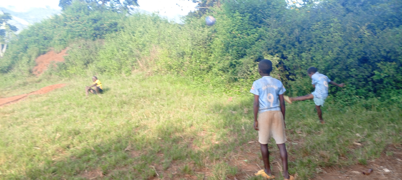 In Ngalula, Democratic Republic of the Congo, a grassy field is bordered by dense green foliage. Three boys are present. One boy is seated on a dirt patch, wearing a yellow shirt. Two boys stand close…read more