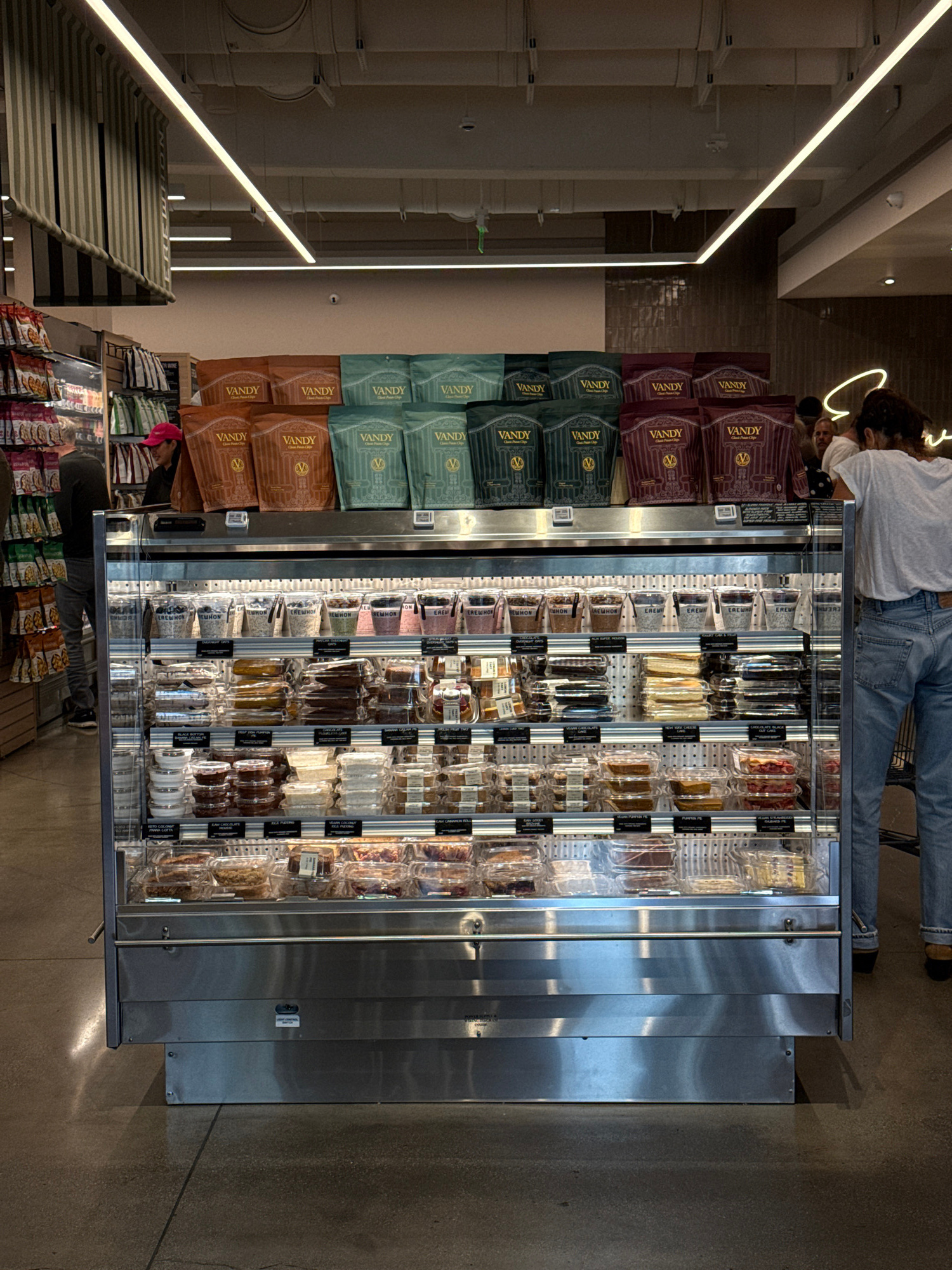 Here is a forensic description of the image: The image shows the interior of a grocery store. A refrigerated display case is prominently featured, stocked with items like packaged foods, including “V…read more