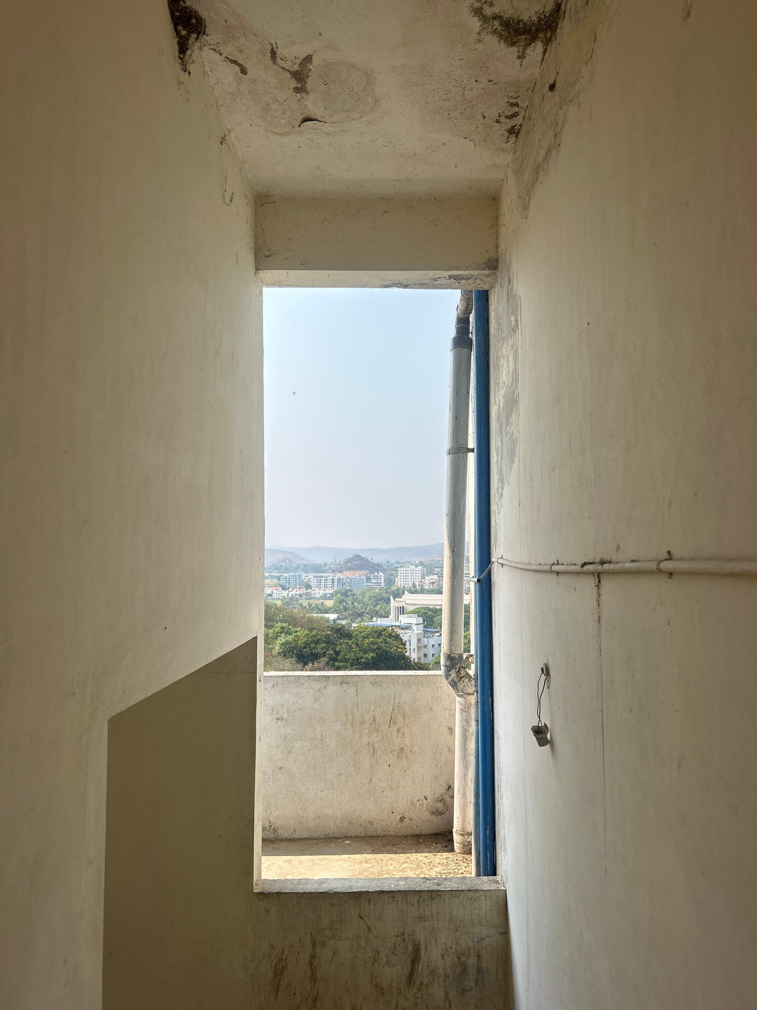 The image shows a view from an unfinished, concrete room in Puttaparthi, India. The room appears to be part of a building under construction or in a state of disrepair, evidenced by the exposed concre…read more