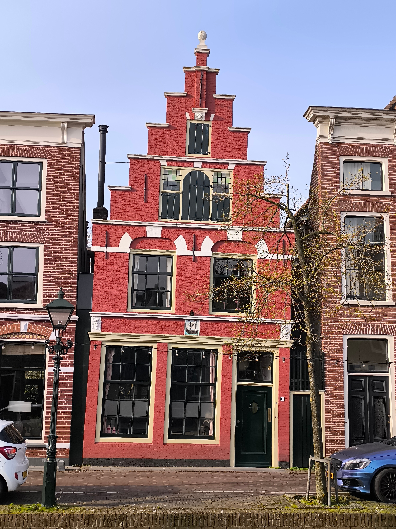 The image shows a street in Alkmaar, Netherlands, featuring three buildings. The central building is three stories tall, painted bright red, and has a stepped gable facade with a decorative ornament o…read more