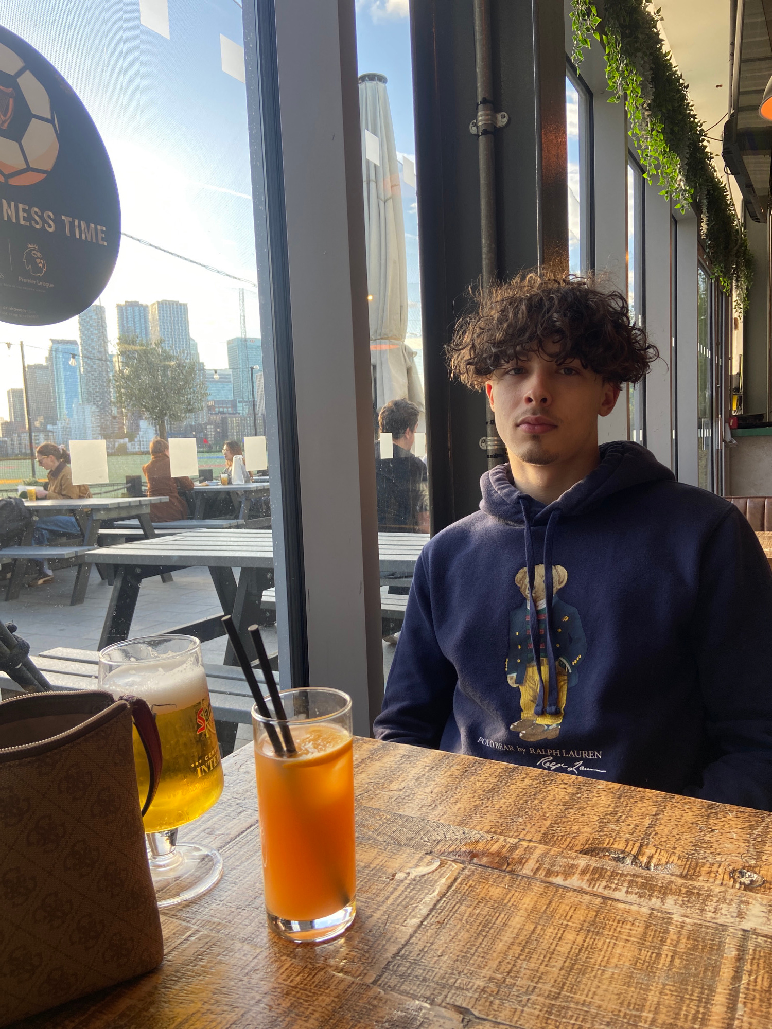 The image, taken in London, UK, captures a young man seated indoors at a wooden table in what appears to be a cafe or restaurant. He has curly dark hair and a light goatee, looking directly at the vie…read more