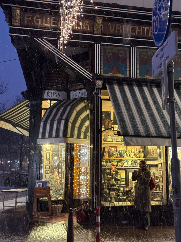 A storefront with awnings, displaying the signage "F. GLEG." above "VRUCHTEN," and "KUNST KRAME" on the side. A pedestrian wearing a red hat examines items inside. The shop window is full of vases, paintings, and various artifacts. Outside, on the snowy street, stands furniture. Street lights are visible, and Christmas lights adorn the shop's exterior. | Open Wire