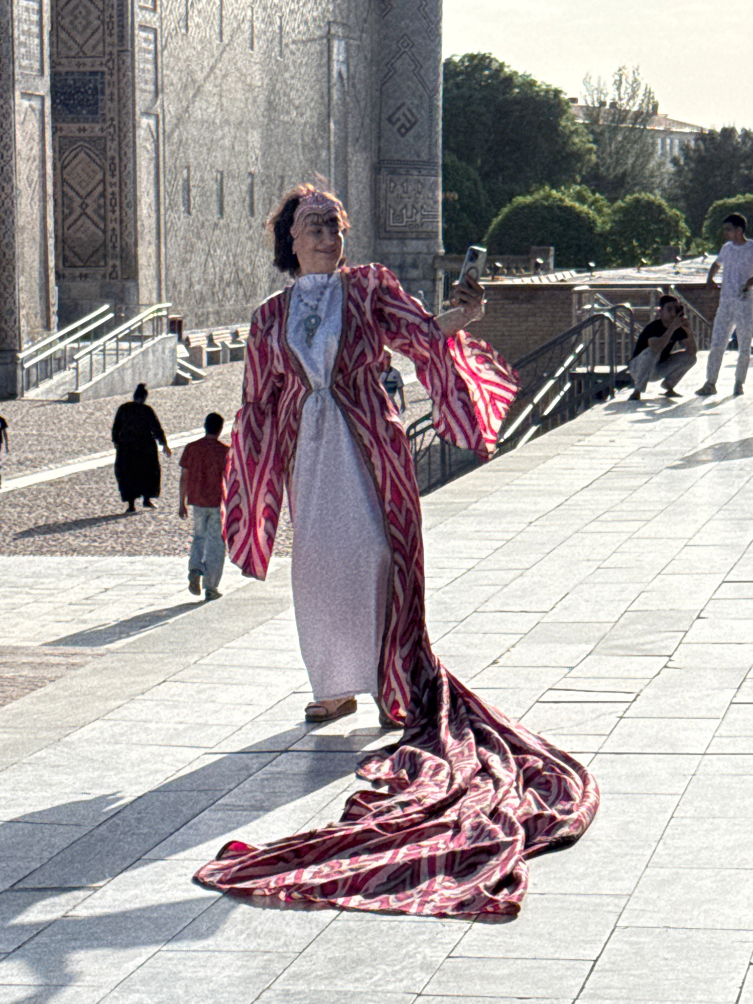 The image depicts a woman in Samarkand City, Uzbekistan, seemingly taking a photo with her phone in front of an ornate building. She is wearing a long, patterned robe or dress, primarily in shades of…read more