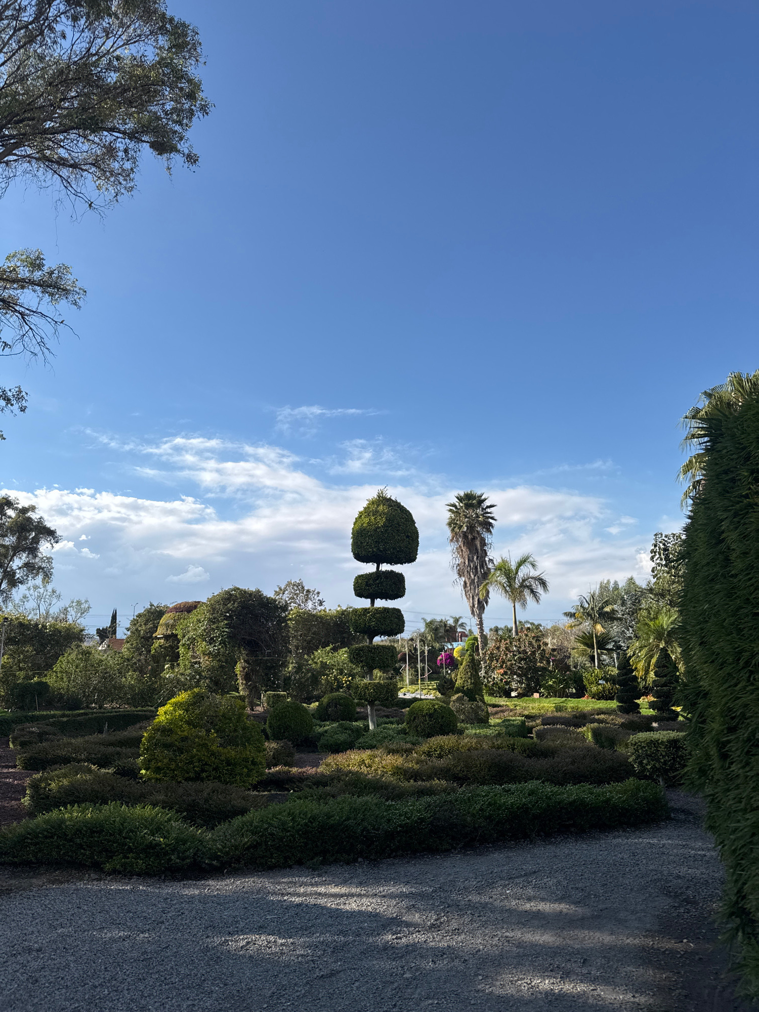 The image captures a landscape in Santa Ana Yancuitlalpan (Chilhuacán), Mexico, likely a botanical garden or well-maintained park. The scene presents a gravel path running alongside meticulously manicured hedges and topiaries of various shapes, including stacked spheres. The sky is a bright blue with wispy clouds. Taller trees, including palm trees, rise in the background beyond the hedges. The overall impression is of a carefully cultivated and serene environment. There are no visible people or interactions depicted in the frame. | Open Wire