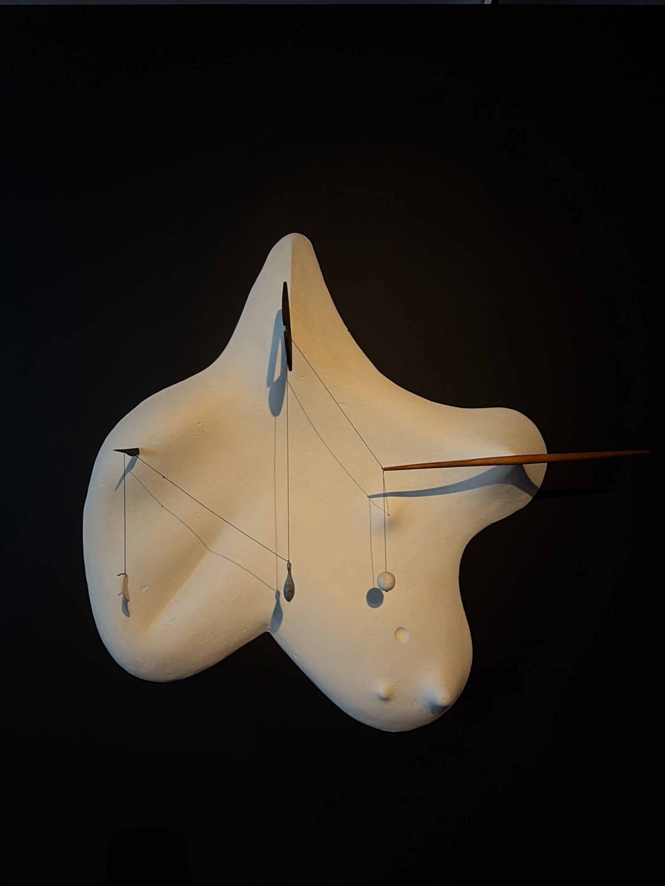 A photograph shows a stark white sculpture with elements of abstract surrealism. The sculpture hangs against a black background. Thin black lines are strung across the sculpture and hold small objects…read more