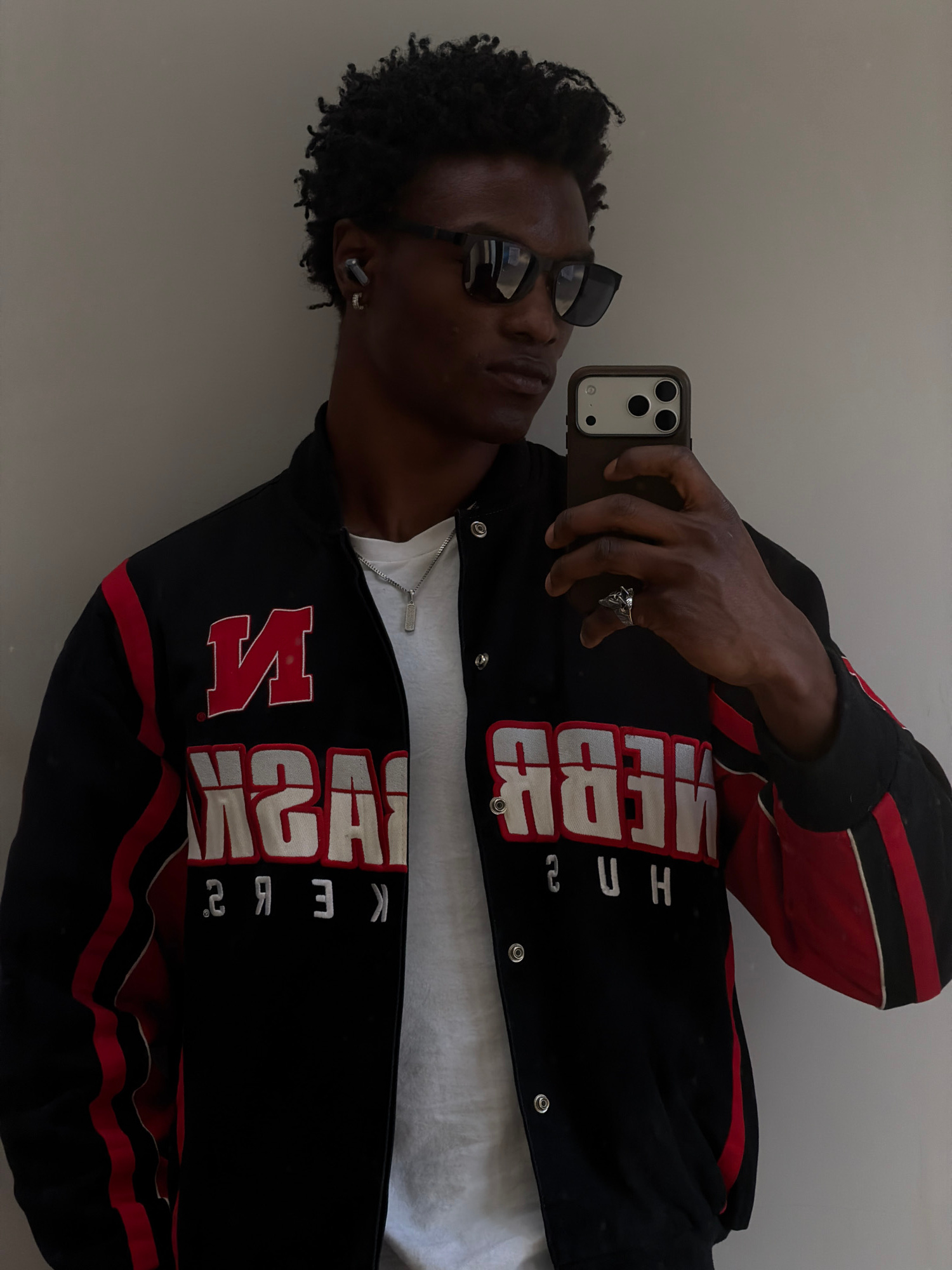 A man wearing sunglasses and a black jacket with red and white lettering is taking a selfie. He is wearing a white t-shirt underneath the jacket, and a silver ring on his finger. The background is a p…read more