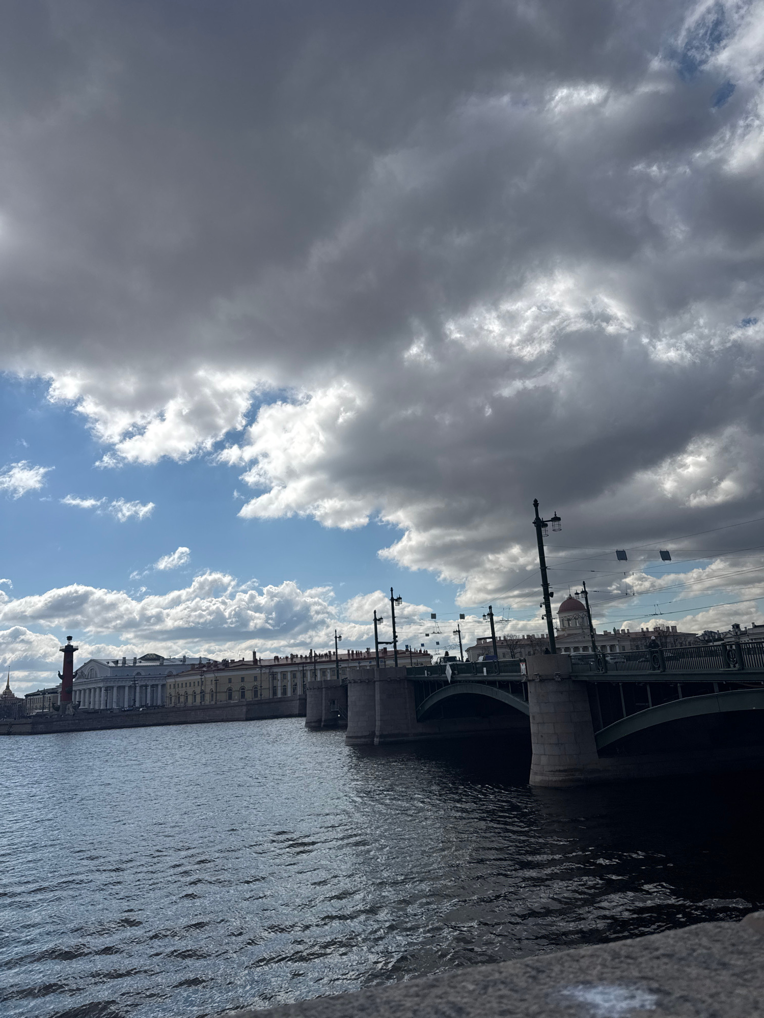 The image captures a panoramic view of the Neva River in Saint Petersburg, Russia, under a dramatic sky. The scene is dominated by a wide expanse of water on the right, showing ripples and reflections…read more