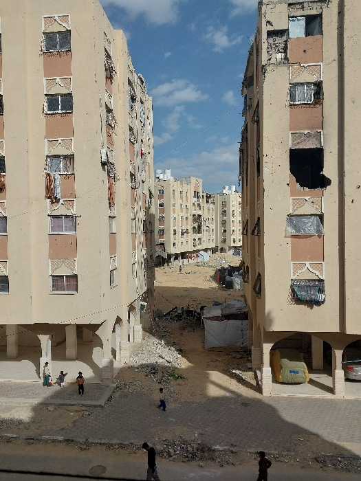 This image depicts a scene within Khan Yunis, Palestinian Territory, characterized by heavily damaged multi-story residential buildings under a partly cloudy sky. Two prominent light-tan apartment blo…read more