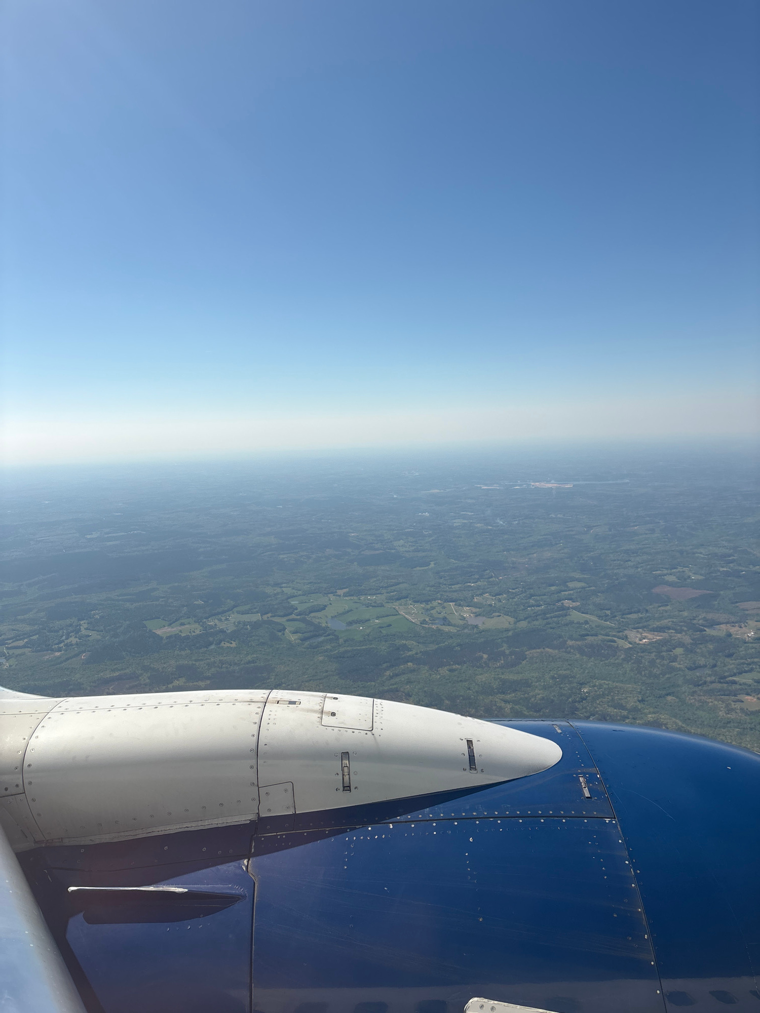 An aerial view from an airplane window. The window frame is on the right and consists of a blue and white part of the engine. Outside the window, a blue sky can be seen on the left and land on the rigβ¦read more