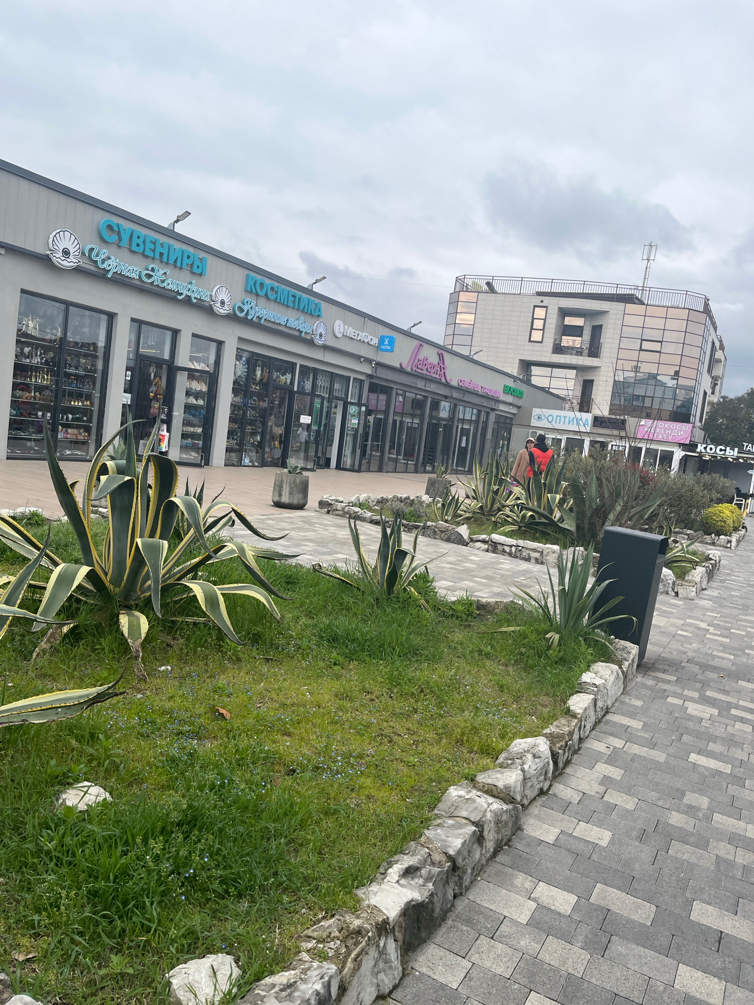 The image depicts a commercial street scene in Sirius, Russia, under an overcast sky. In the foreground and midground, a paved pedestrian area made of light and dark grey rectangular pavers is visible…read more
