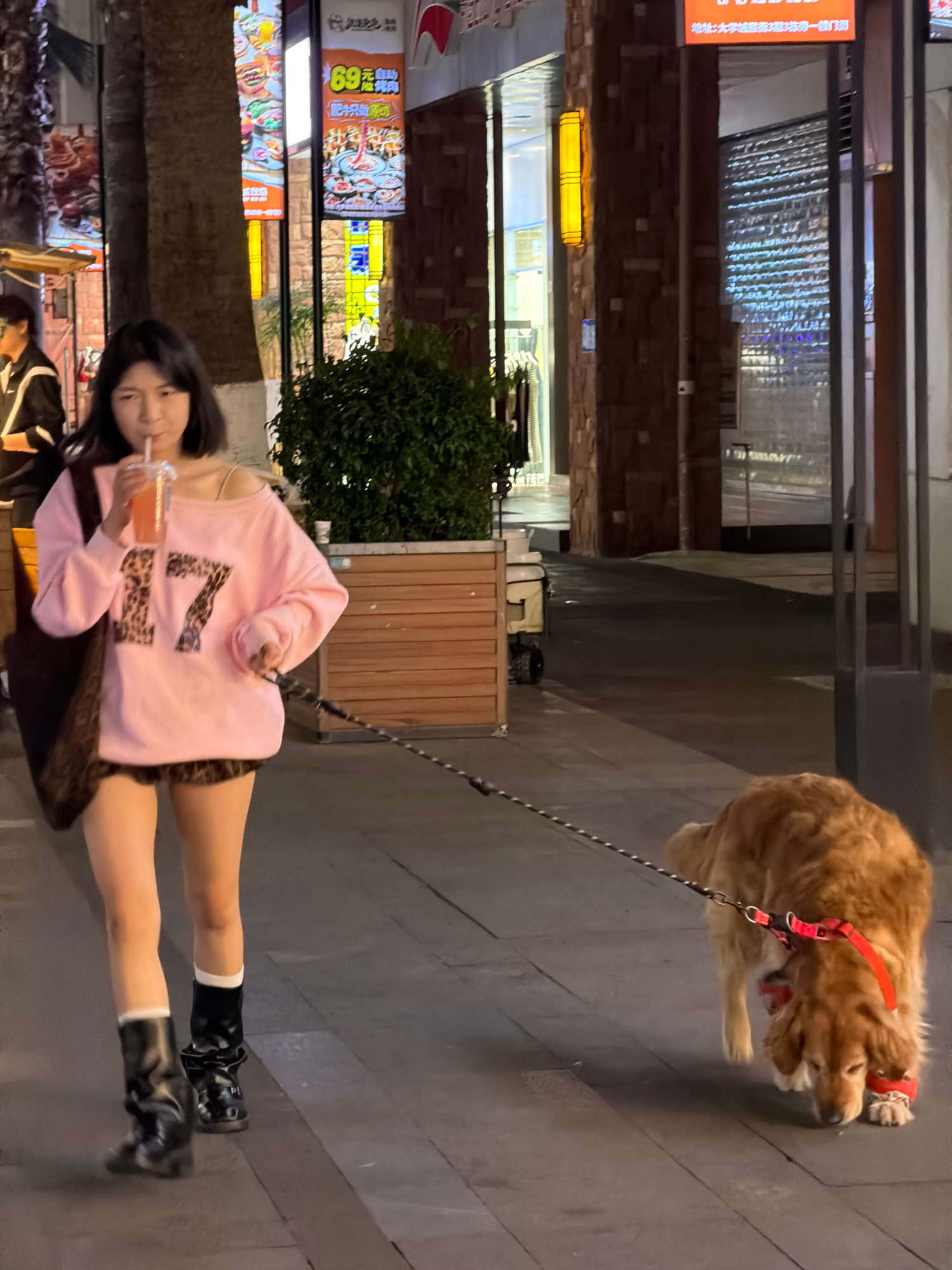 The image depicts a woman walking a dog on a leash on a city street. The woman is wearing a pink sweater with leopard-print detailing, black boots with white socks, and carrying a bag. She is also dri…read more