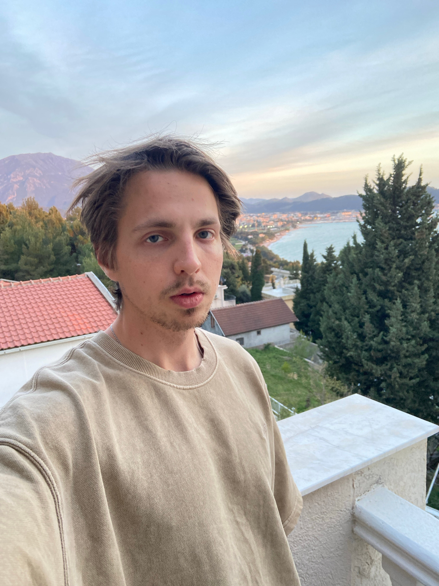 A selfie of a young man with light brown hair and a stubbled beard, wearing a tan sweatshirt, against a backdrop of Šušanj, Montenegro. The setting is a balcony or elevated area overlooking the city.…read more