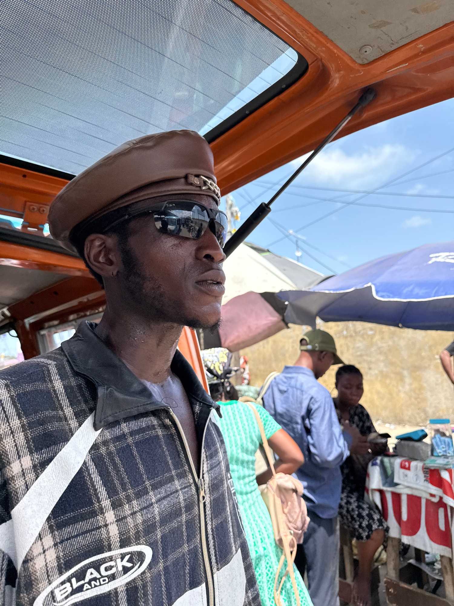 In a candid, high-angle perspective shot taken in Lekki, Nigeria, a person wearing a brown beret and sunglasses is seen inside what appears to be an orange taxi or vehicle. The individual is wearing a…read more