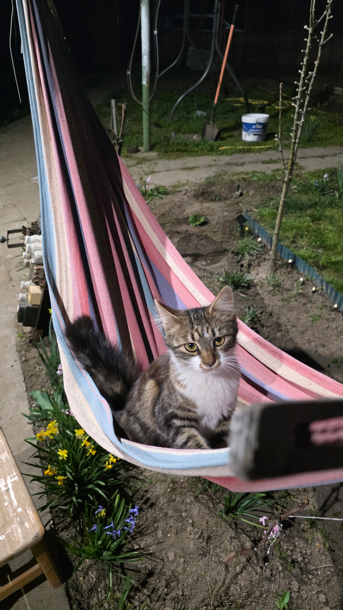 The image displays an outdoor nocturnal scene within a garden or backyard setting in Unknown, Unknown. The central subject is a domestic cat, exhibiting tabby markings of brown, black, and grey on its…read more