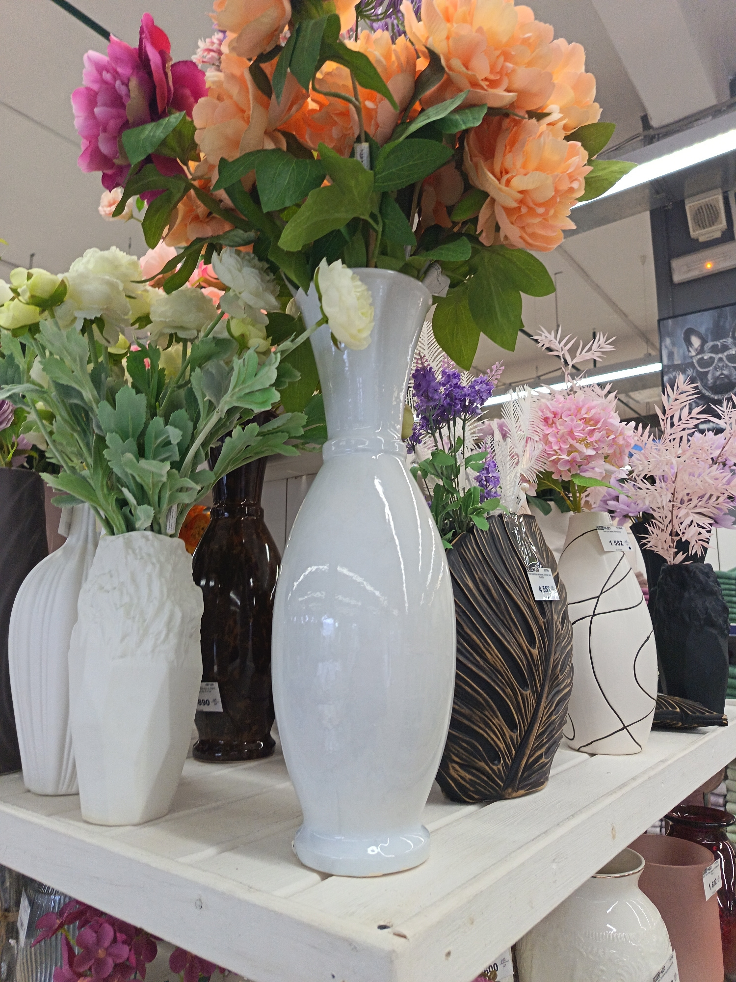 This photo shows a shelf of vases with flowers. There are at least 10 vases of different shapes and sizes. Some of the vases are white, some are brown, and some are black. The flowers in the vases are…read more