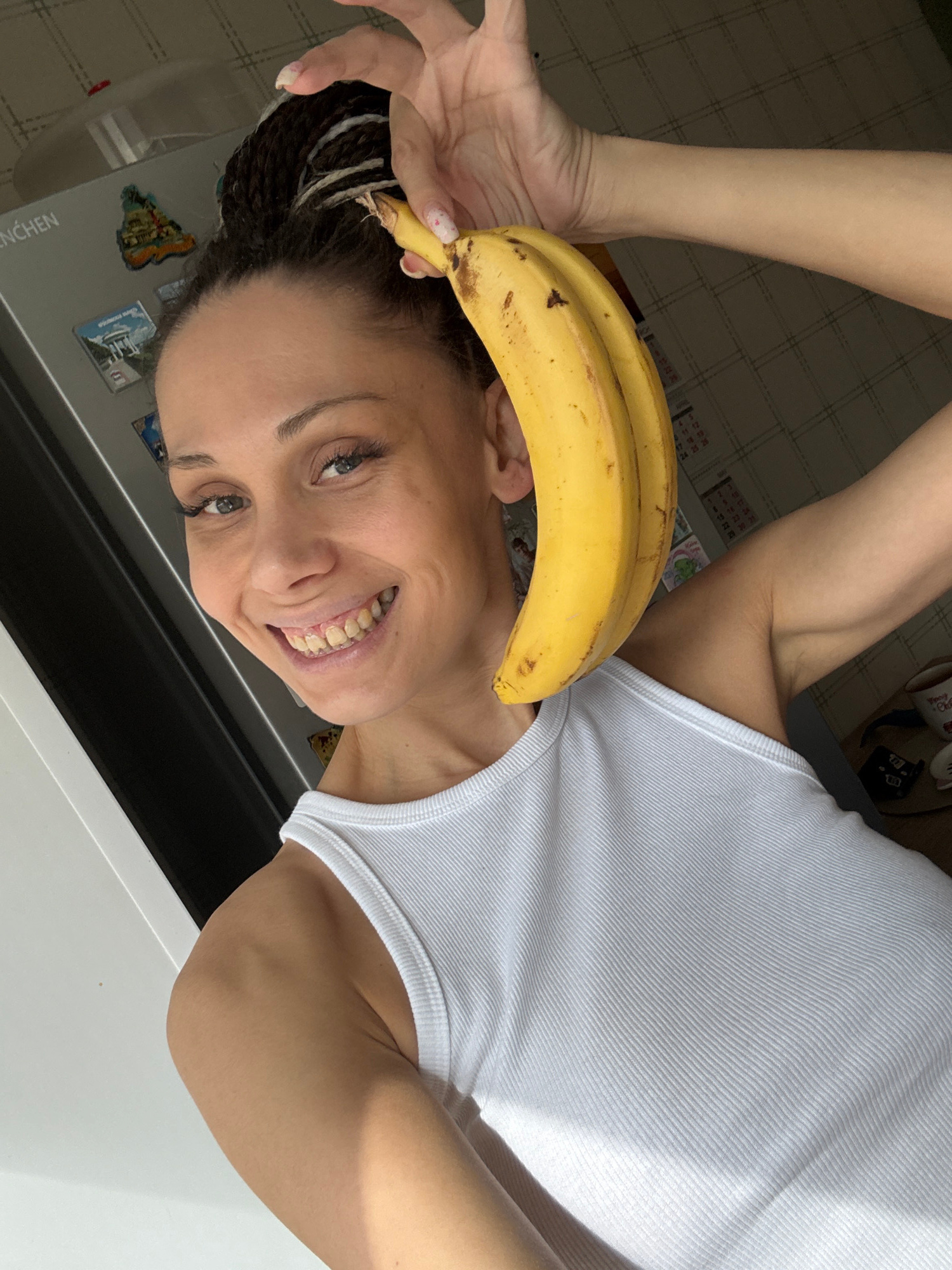A woman with braided hair and a white tank top holds two bananas on top of her head. She is smiling and looking at the camera. She is indoors in a kitchen next to a white appliance with magnets on it.…read more