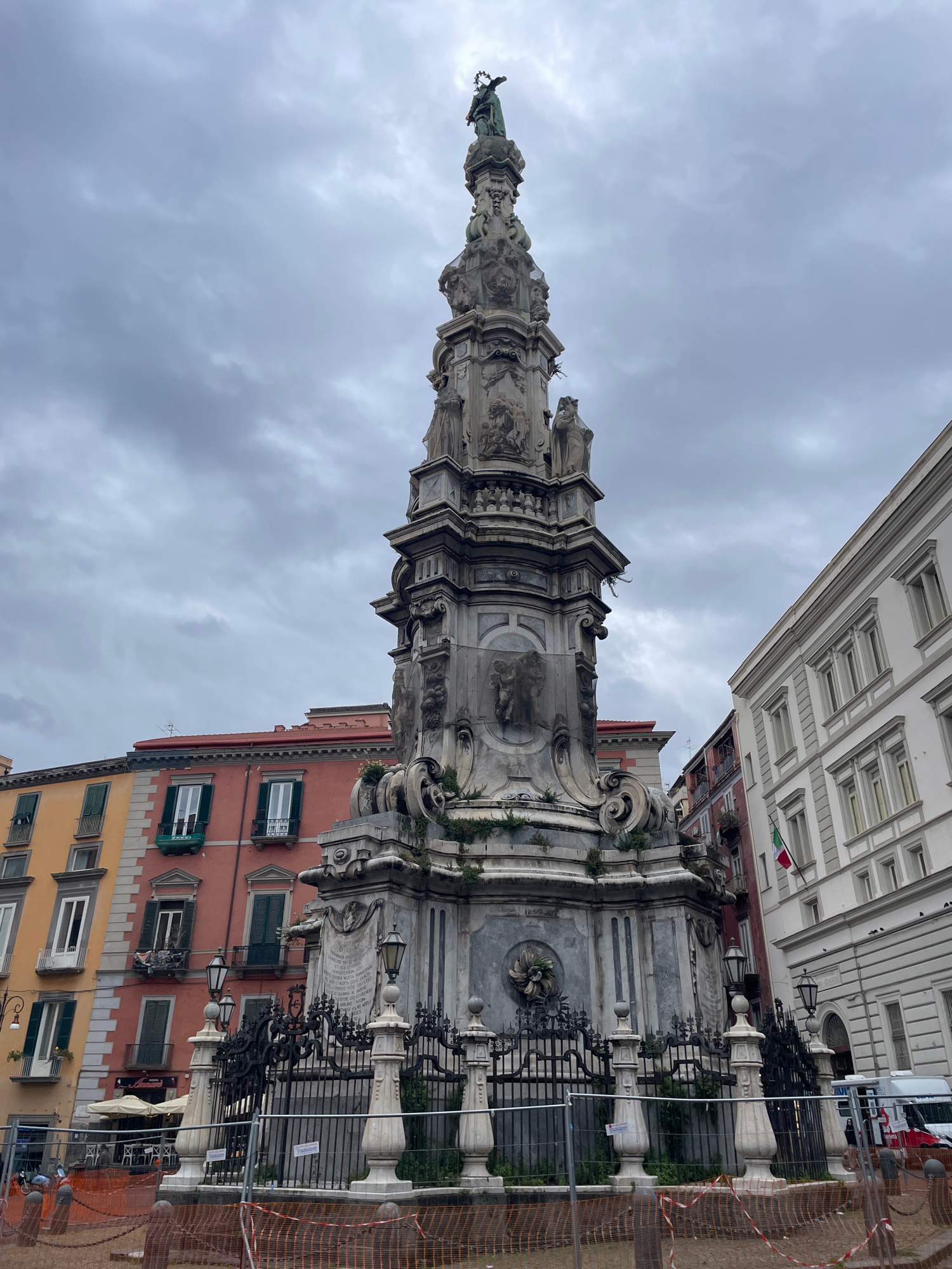 The image depicts the Guglia dell'Immacolata (Obelisco dell'Immacolata) in Piazza del Gesù Nuovo, Naples, Italy, under an overcast sky. The central subject is a tall, ornate Baroque-style obelisk-mon…read more