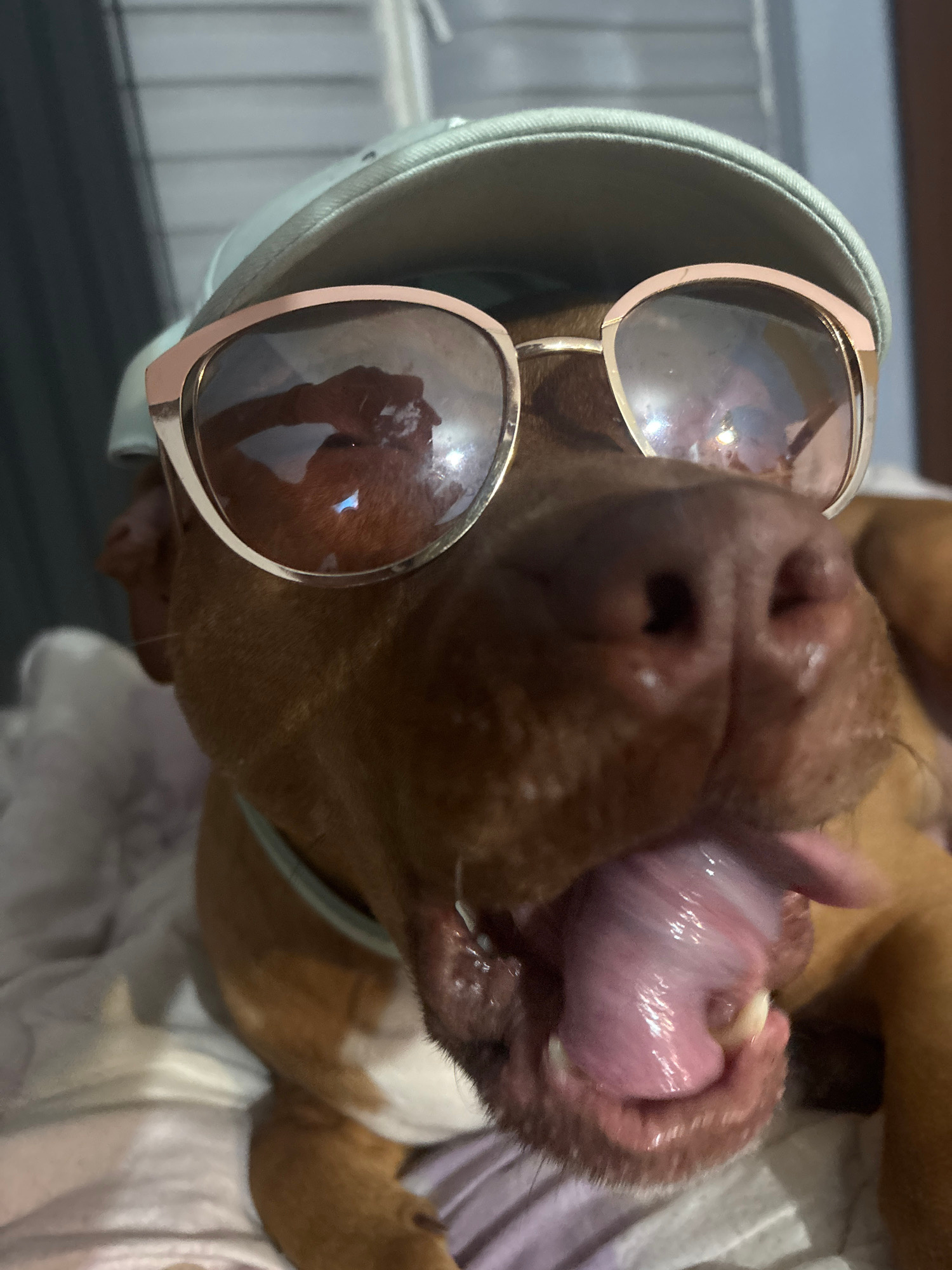 A close-up, low-angle shot depicts a brown dog wearing sunglasses and a light green cap, with its tongue protruding from its mouth. The dog appears to be lying on patterned bedding. In the blurred bac…read more