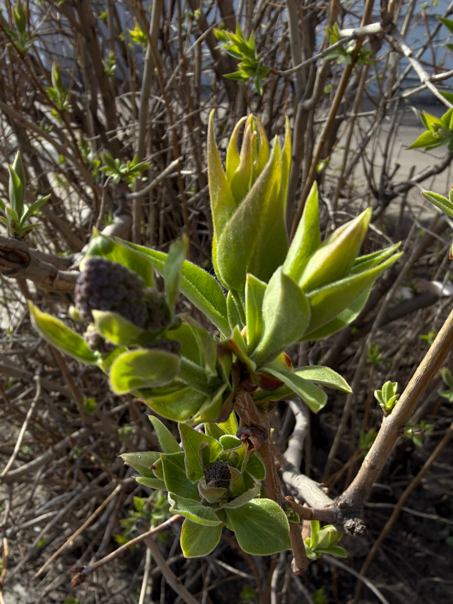 The image shows a close-up of a budding plant with green leaves and a purplish flower cluster. The plant appears to be a bush or shrub, with a network of brown branches in the background. New leaves a…read more