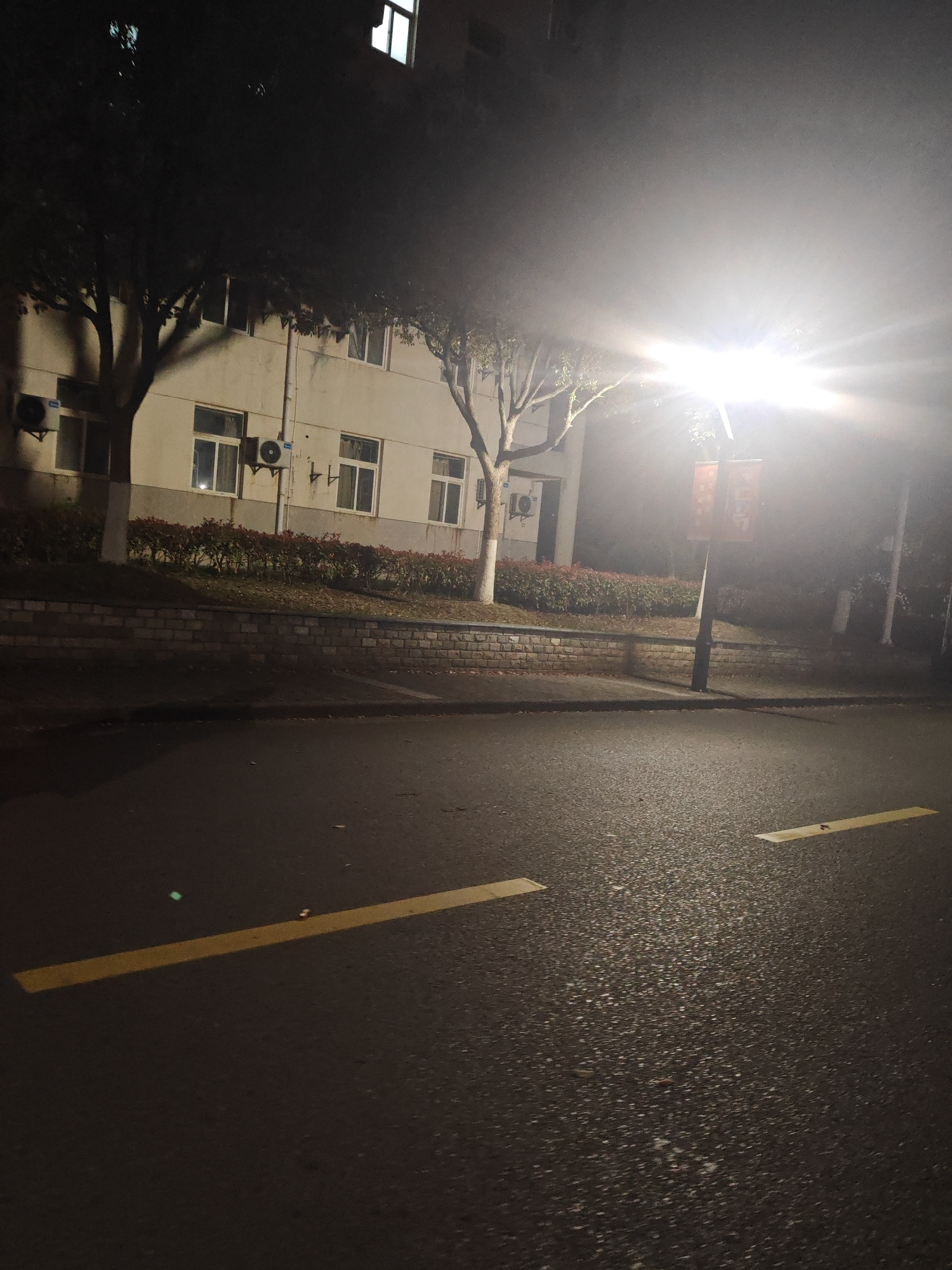 A nighttime shot of a street in Jiangning District, China. A two-story building with multiple windows and several air conditioning units attached to the exterior is situated behind a brick retaining w…read more