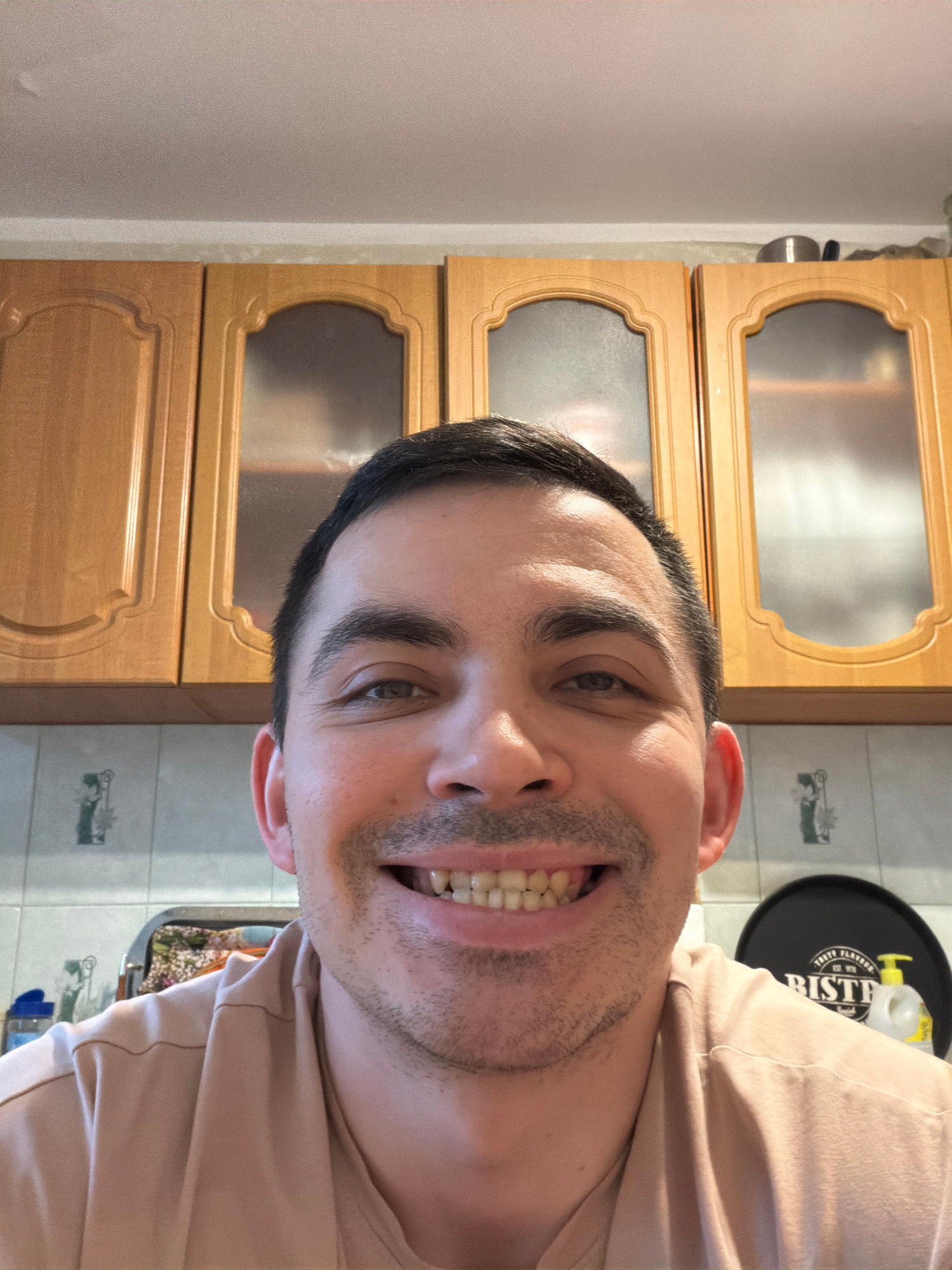 A close-up, slightly rotated image shows a Caucasian man smiling at the camera. He has dark hair, dark eyebrows, and a short beard. He is wearing a light pink shirt. The background includes wooden cab…read more