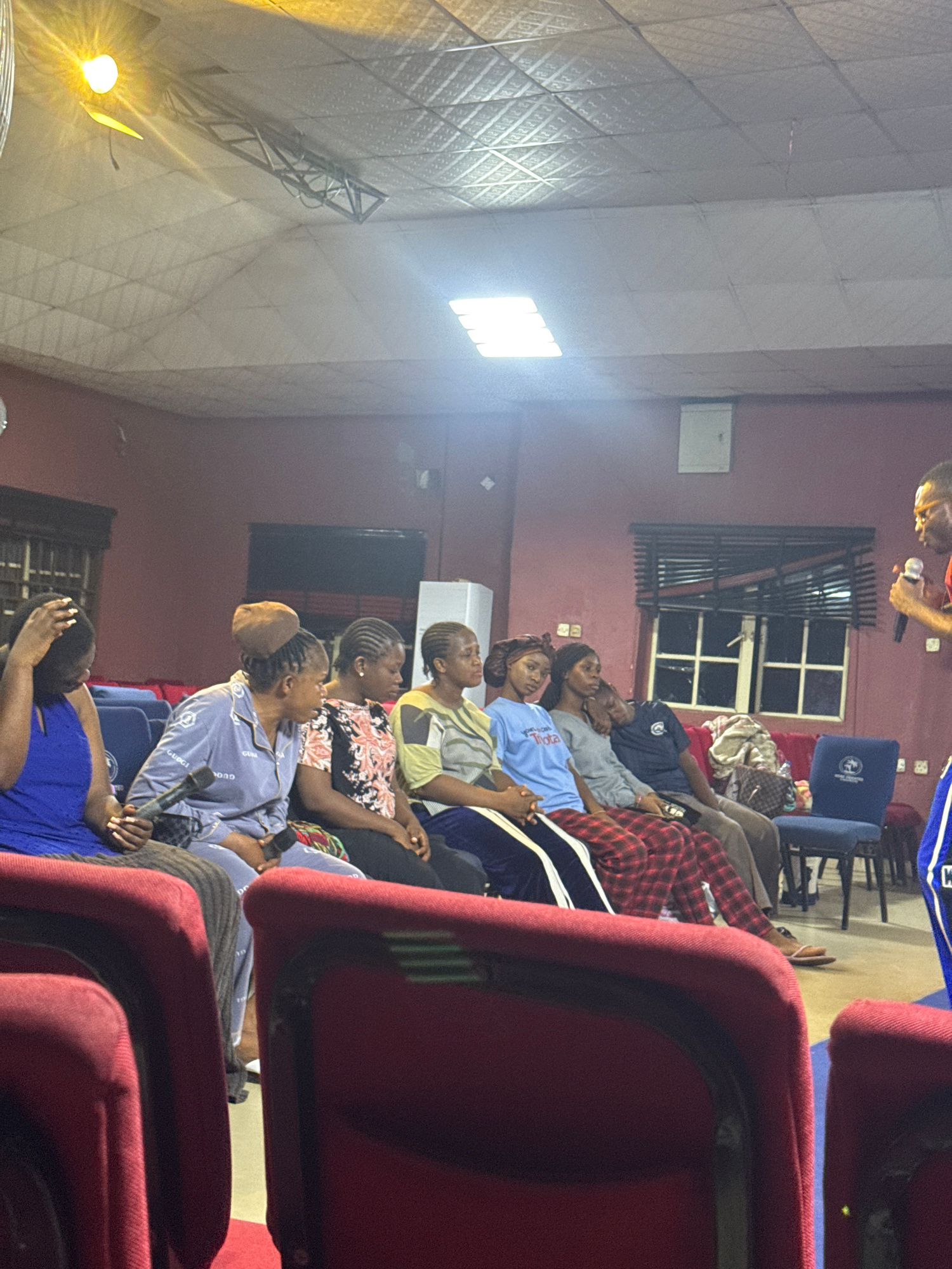 A group of people are seated in rows of red chairs in what appears to be a hall or auditorium in Onitsha, Nigeria. Most of the attendees are women. A speaker stands at the front of the room, holding a…read more