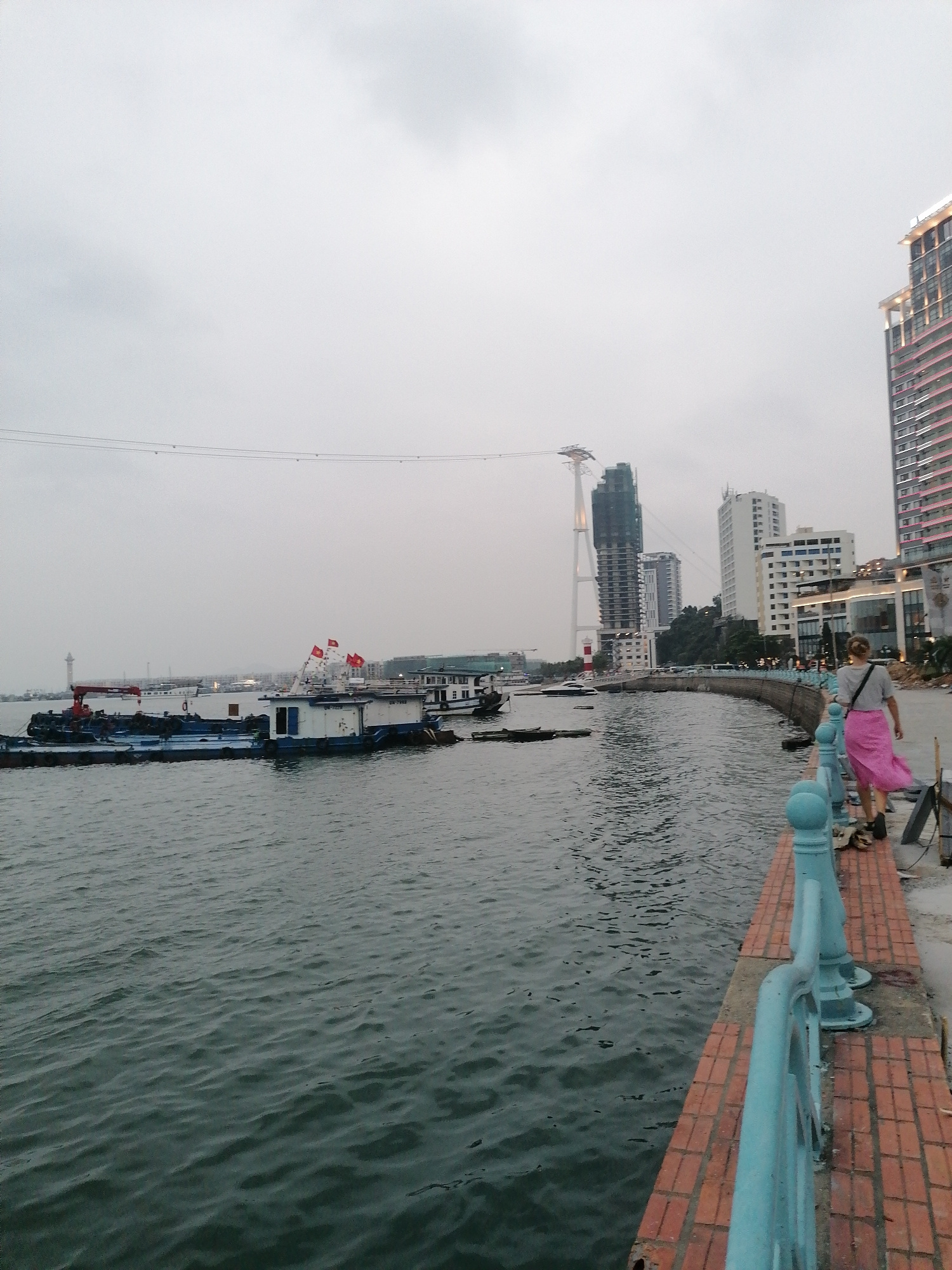 A person wearing a gray shirt and a pink skirt walks on a brick walkway alongside a body of water. A light-blue railing borders the walkway. In the water, there are several boats, some adorned with re…read more