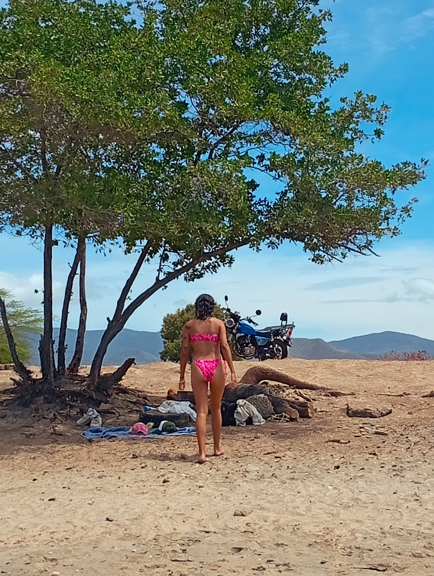 A woman wearing a pink bikini is walking away from the viewer on a sandy beach. She is positioned near the base of a tree with several slender trunks and lush green foliage. Under the tree, there is a…read more