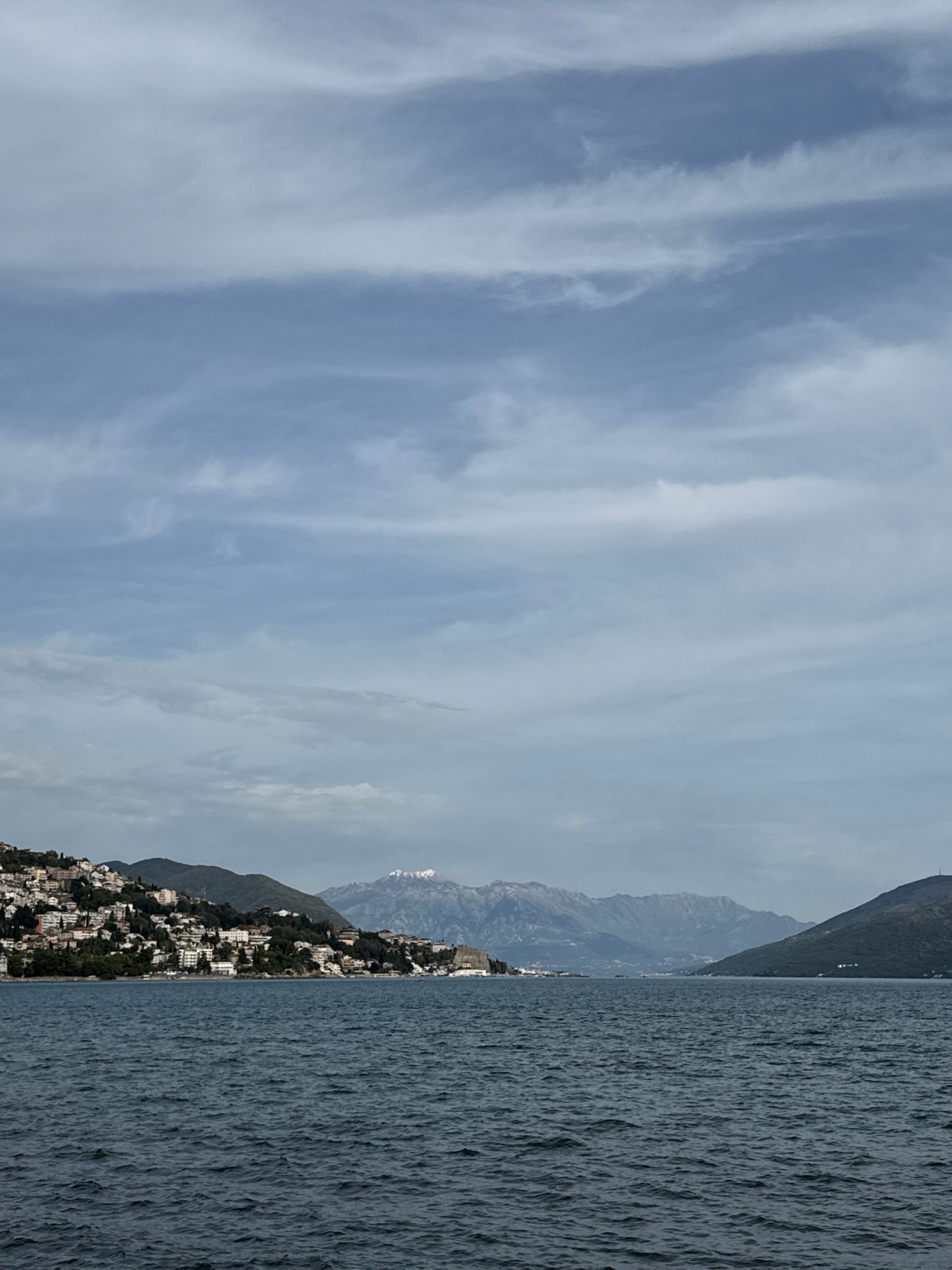 The image depicts a coastal scene, likely near Igalo, Montenegro. The right side shows a dark, choppy body of water, possibly the Adriatic Sea. To the left of the water, a hillside is densely populat…read more
