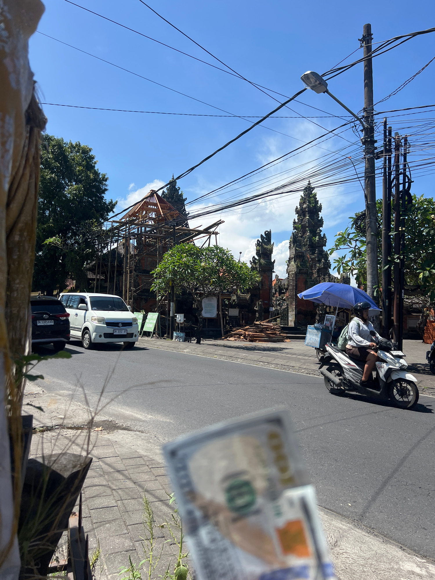 The photograph, taken in Singapadu Tengah, Indonesia, shows a street scene under a clear blue sky dotted with wispy clouds. Overhead, a dense network of electrical wires dominates the upper portion of…read more