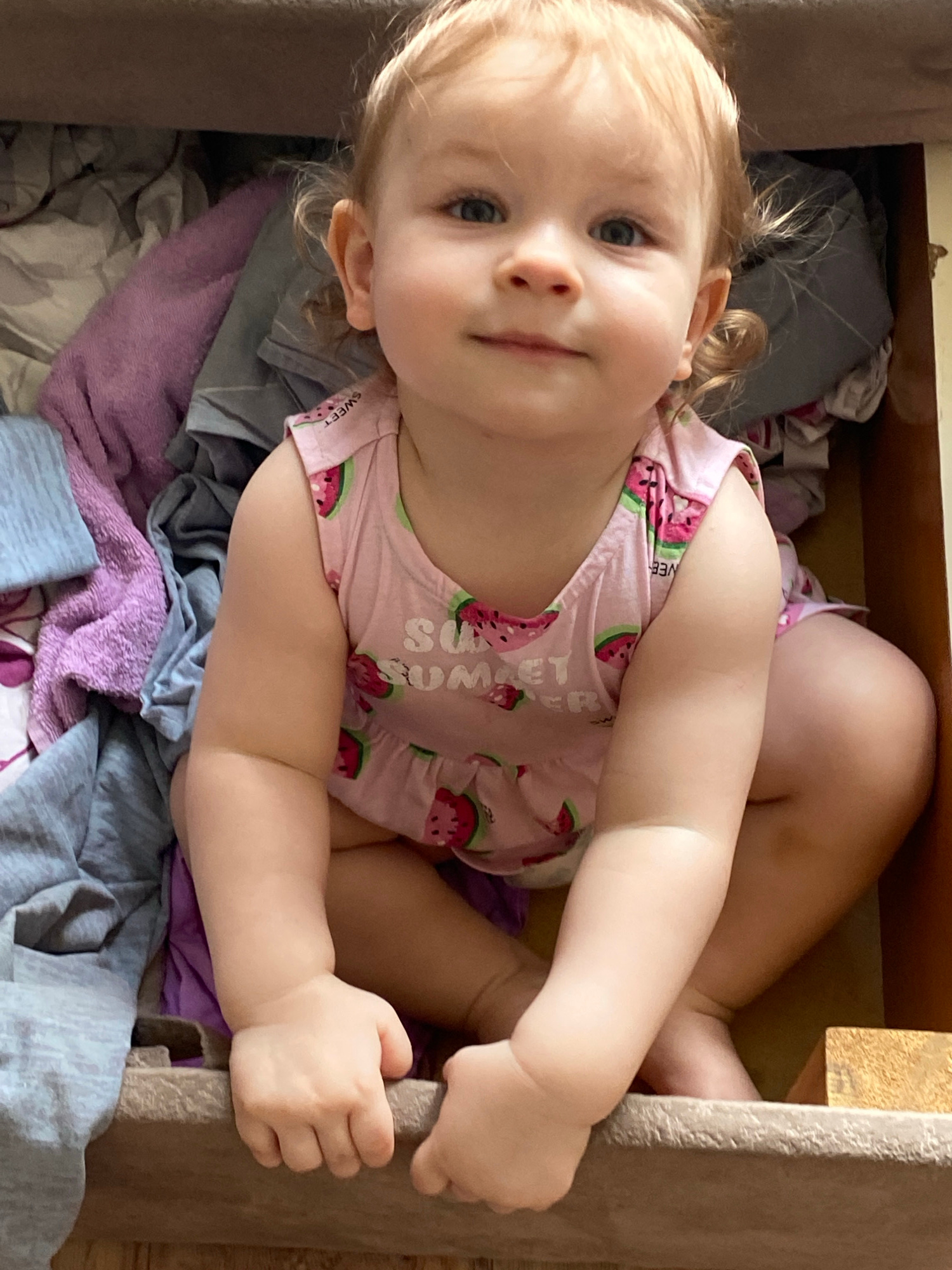 A child lies inside a wooden drawer. The child wears a pink sleeveless shirt with watermelon designs. Various articles of clothing, including gray and purple fabrics, are beneath the child. The locati…read more