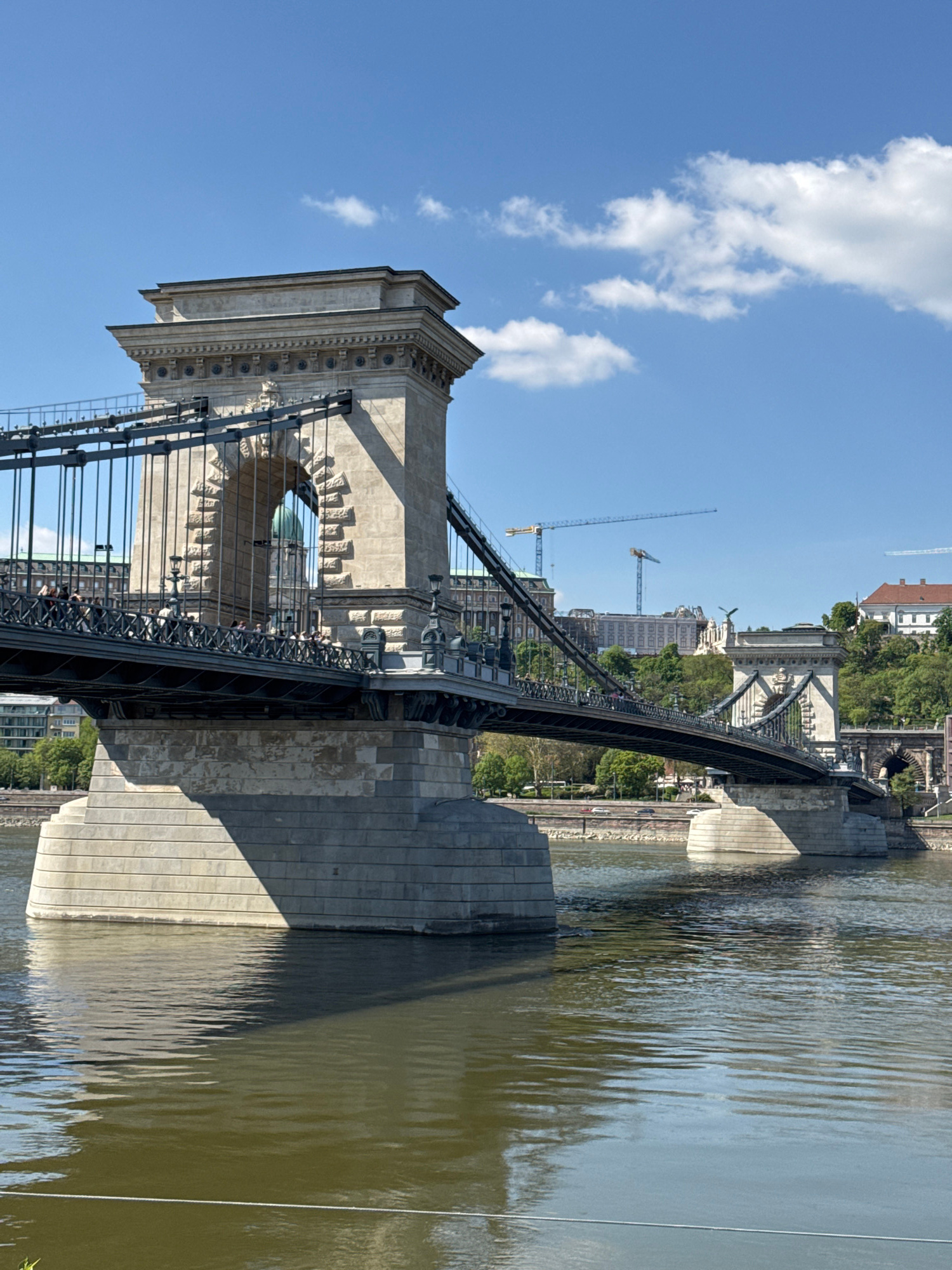 The image shows the Széchenyi Chain Bridge in Budapest, Hungary, from a ground-level perspective. The bridge's stone pillar is prominent, with ornate architectural details. Steel cables and suspension…read more