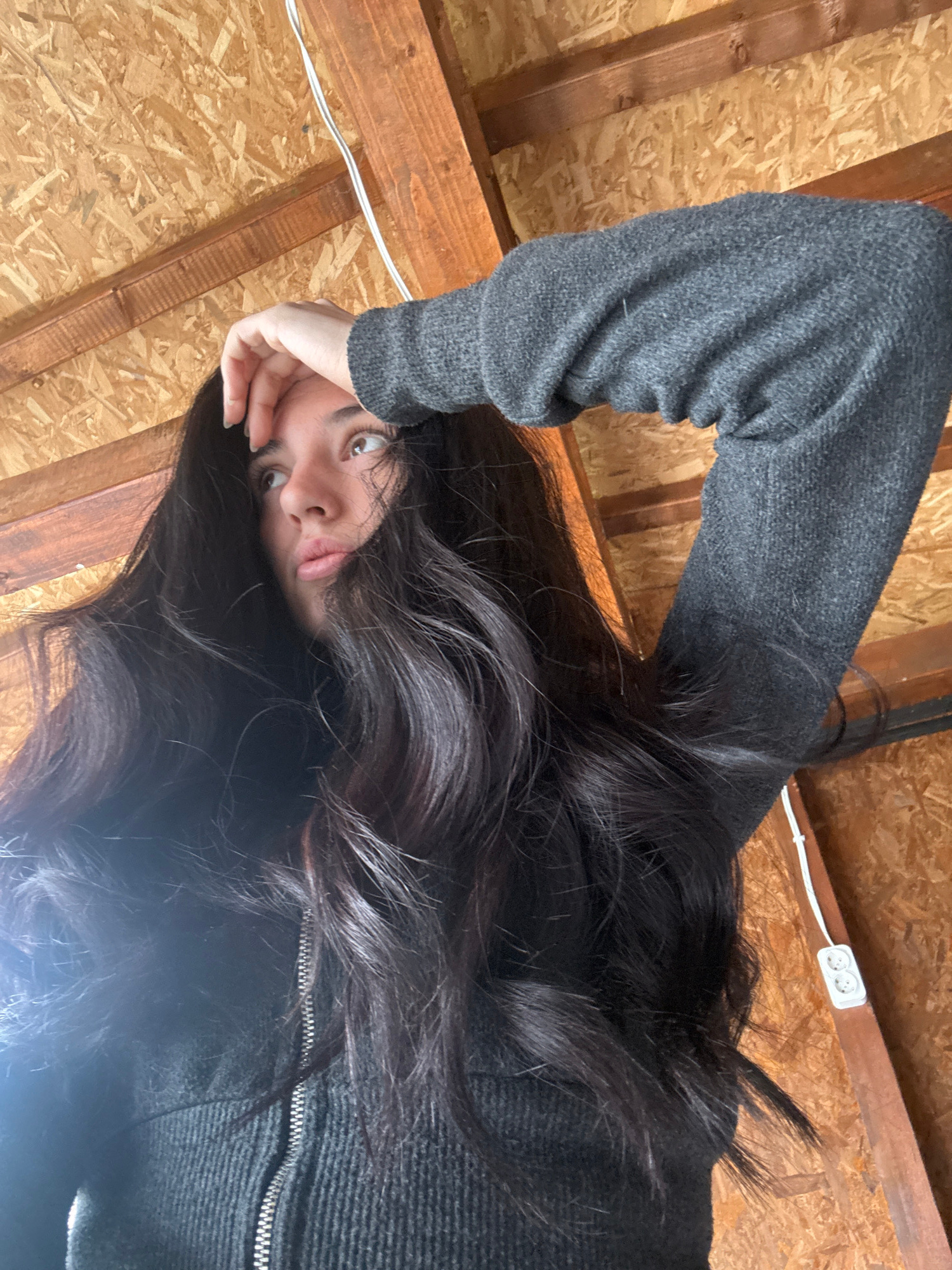 A woman with long, dark hair is positioned at an unusual angle, possibly hanging upside down or leaning back with her head positioned near the ground. She is wearing a dark grey zippered sweatshirt an…read more