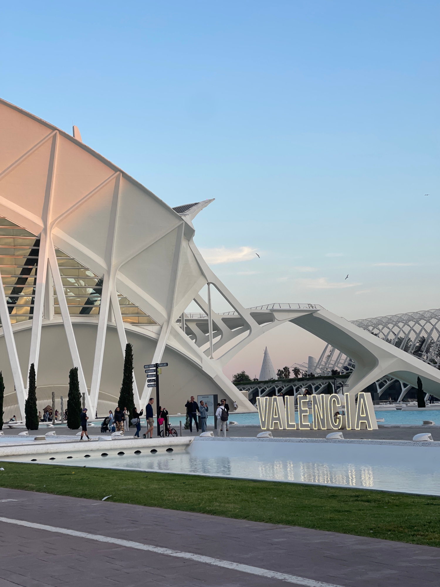 The image depicts the City of Arts and Sciences complex in Valencia, Spain. The foreground includes a prominent white architectural structure with geometric lines and a triangular roof. A large "VALEN…read more