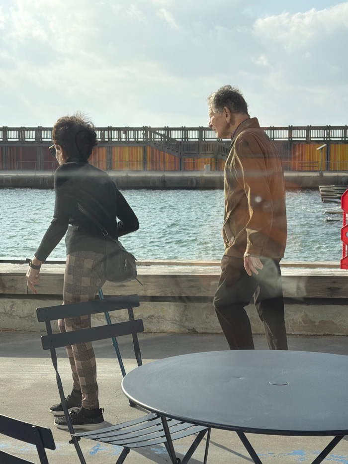 The image depicts an outdoor scene at the Tel Aviv Port (Namal Tel Aviv) in Tel-Aviv, Israel, under bright, partly cloudy daylight. Two elderly individuals are walking from right to left across a conc…read more