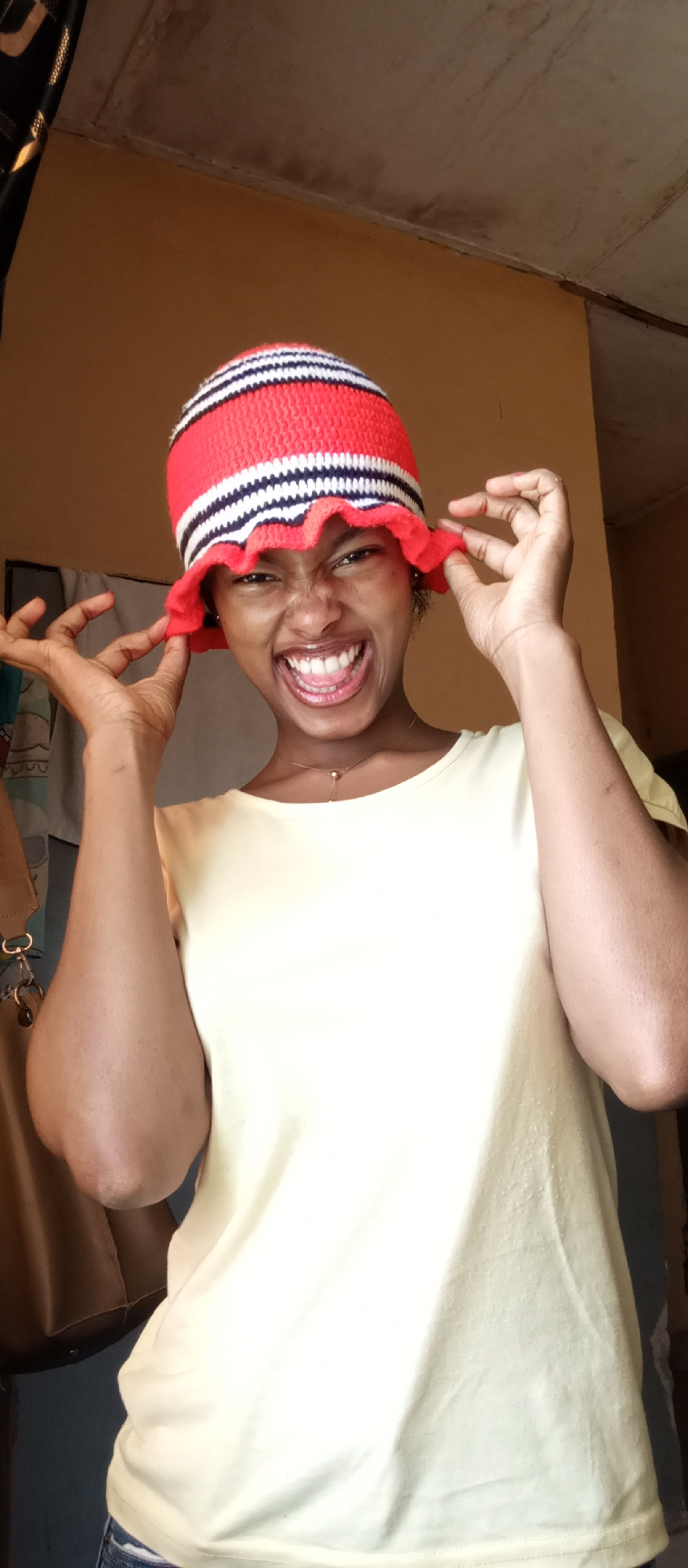 A vibrant, well-lit portrait captures a young woman indoors in Keffi, Nigeria, making a joyful and playful expression. She is the central subject, looking directly at the viewer with a wide, open-mout…read more