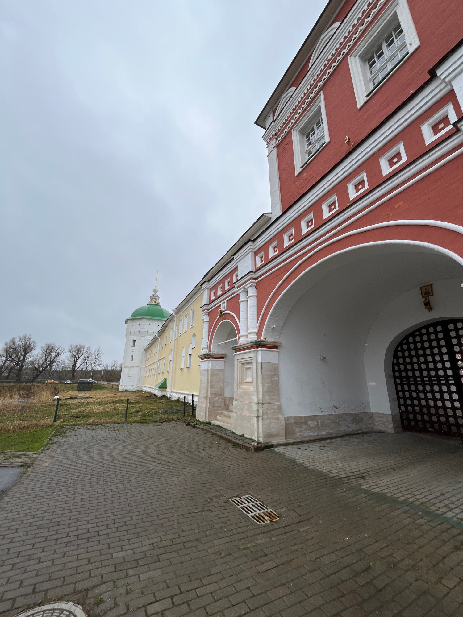 The image depicts a view of a historical architectural structure with red, white, and light-yellow facades. The architectural details include arched openings, windows, and decorative elements. The for…read more