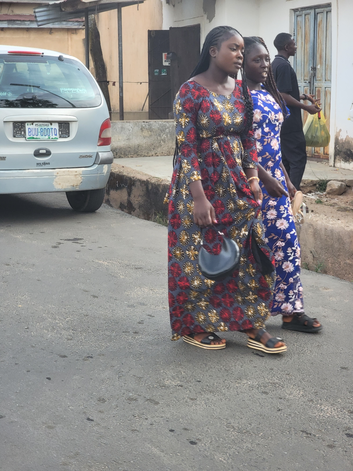 Three individuals are walking along a street. The first two are women wearing patterned dresses and sandals. The first woman is wearing a red and gold floral dress. The second woman is wearing a blue…read more