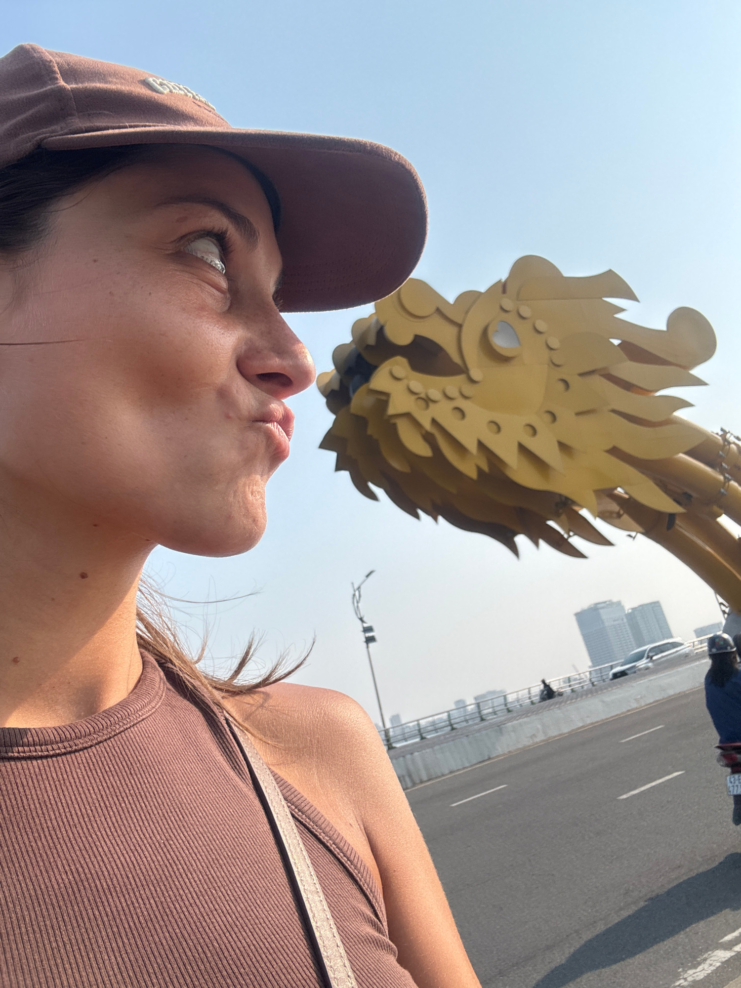 A woman, wearing a brown baseball cap and a brown ribbed tank top, looks up at the golden head of the dragon sculpture on the Dragon Bridge in Đà Nẵng, Vietnam. The bridge, including the road with car…read more