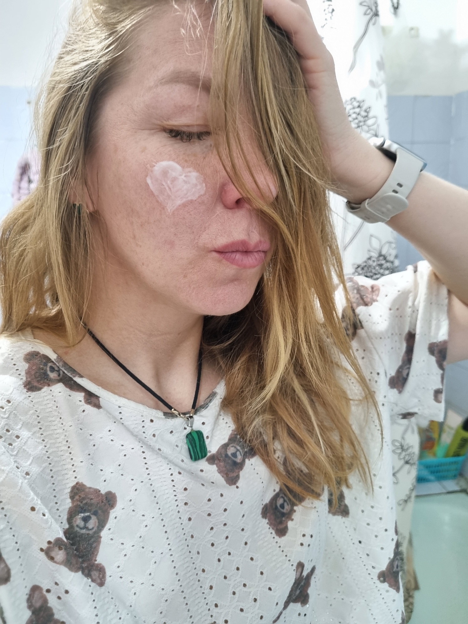 A woman with fair skin and blonde hair is lying down, wearing a white shirt with teddy bear patterns and eyelet detailing. There is a dollop of white cream on her face. She has a black cord necklace w…read more