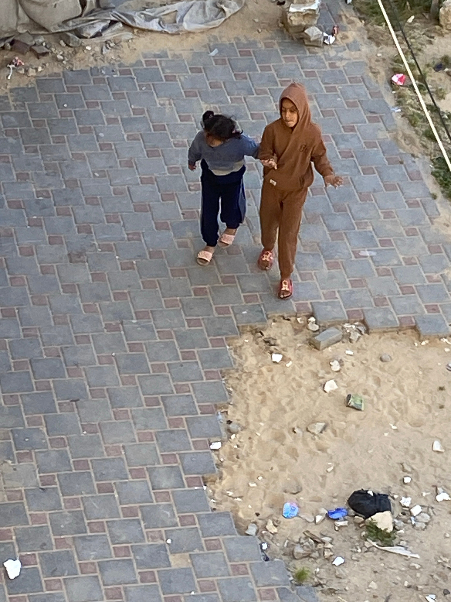 Two individuals stand on a gray-and-maroon brick walkway adjacent to a patch of sand and debris. The person on top wears a brown hooded tracksuit and the person below wears a gray shirt and navy pants…read more