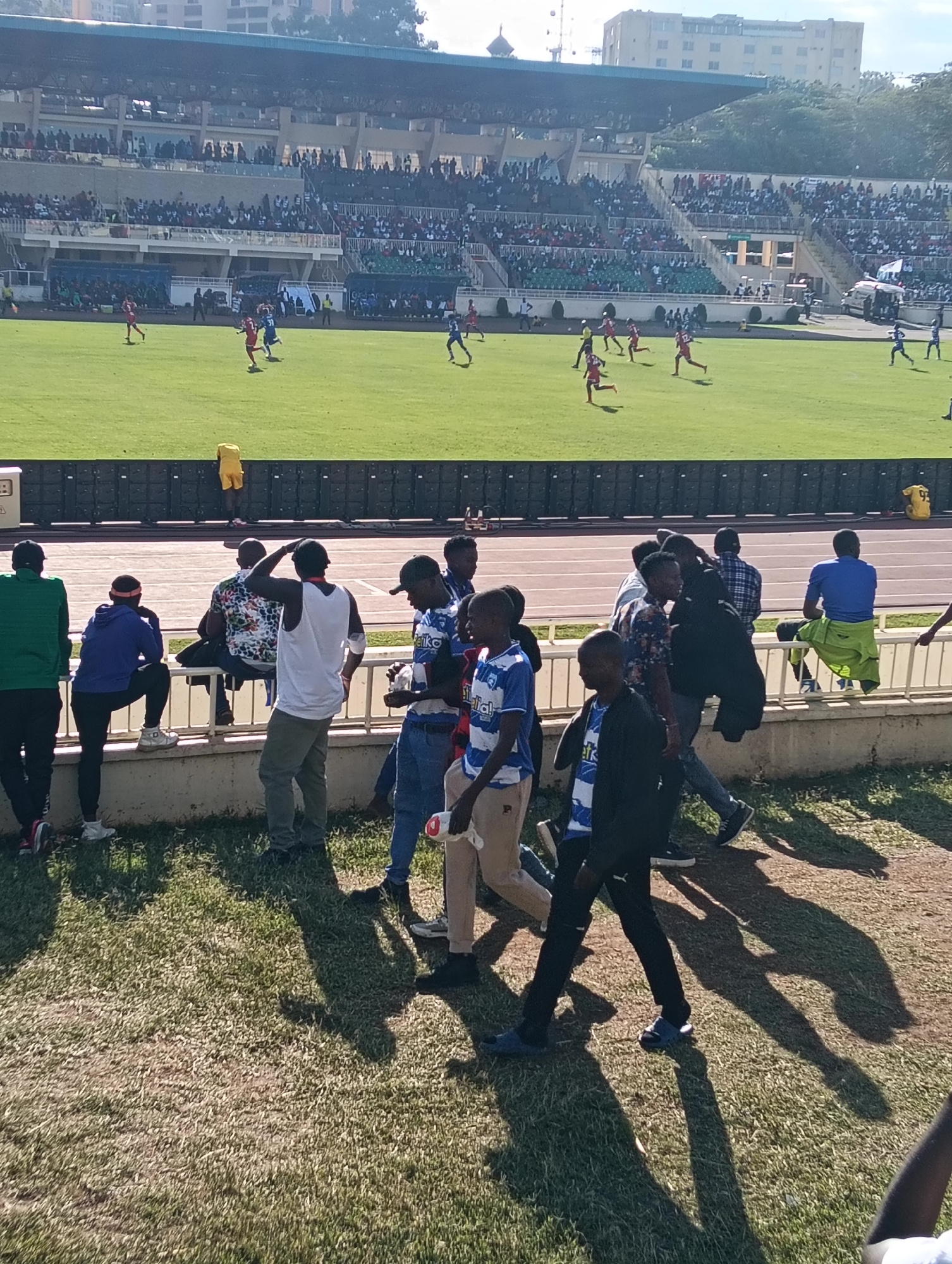 This image captures an active football match at a stadium in Nairobi, Kenya, under bright, sunny daylight. The scene unfolds from a slightly elevated perspective, looking down towards the pitch and ac…read more