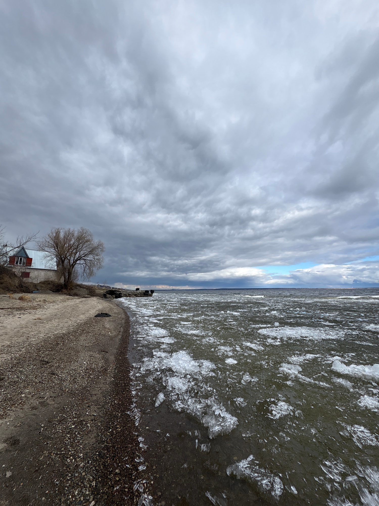 The image depicts a shoreline scene in Ulyanovsk, Russia, characterized by a gray, overcast sky. The foreground features a concrete embankment, leading to a beach of small rocks and sediment. A bare t…read more